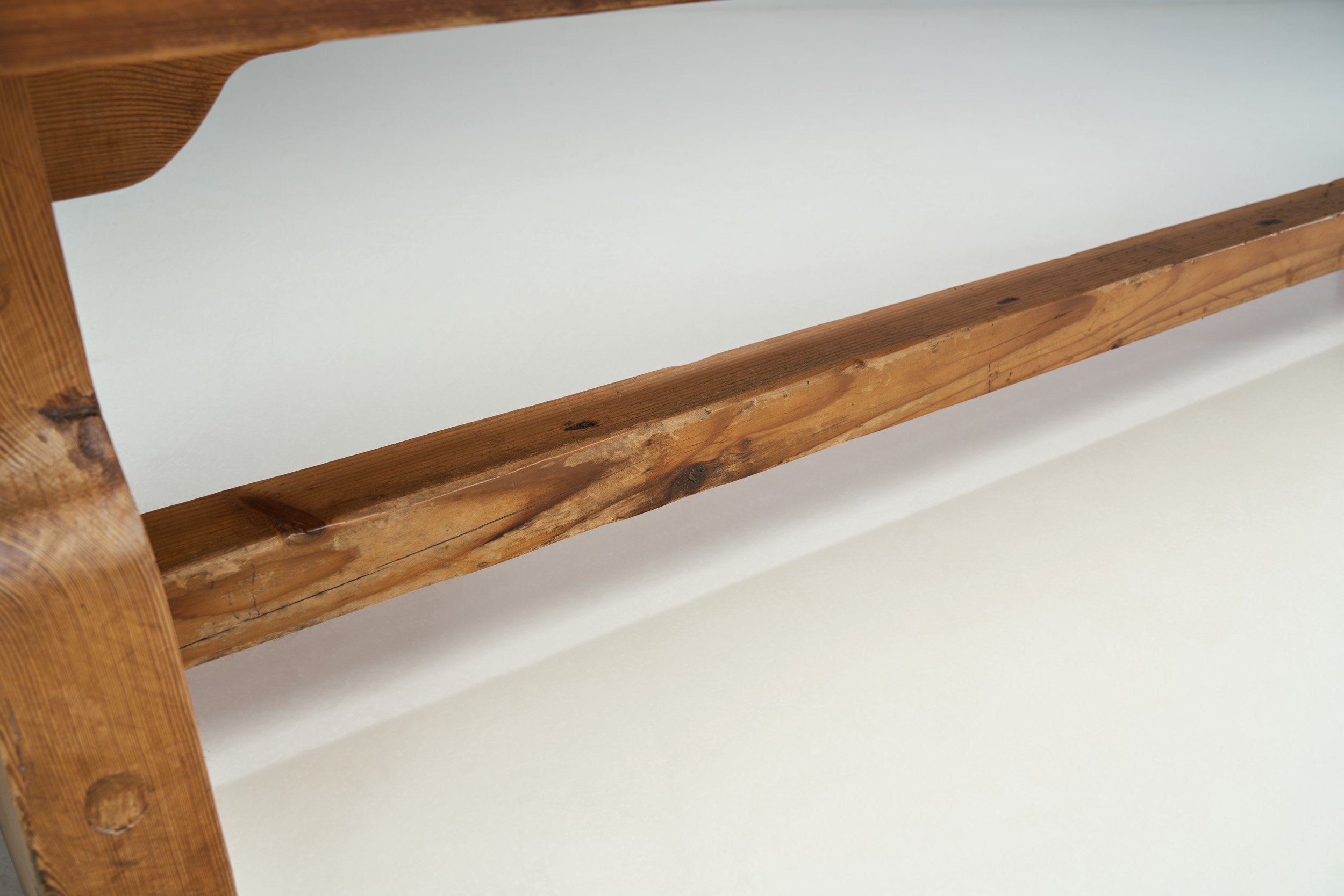 The marks of Brutalism can be observed in the unornamented, solid wood, exposed joints, and raw oaken surfaces. The design of this table projects an air of strength and solidity. At the same time, thanks to the distance between the top and the stretcher, this bench still manages to look airy. The rectangular seat is supported by an interesting lower structure, including widening legs that are defined by brutalist simplicity and expert woodworking. The precise connecting and adjusting elements are akin to the Japanese “Kumiki”, a wooden building technology where grooved wood pieces are joined together to form sturdy three-dimensional objects, and making it possible to produce longer pieces. The lower structure’s connection to the seat and the horizontal stretcher’s connection to the legs show the mastery of this technique in this table.