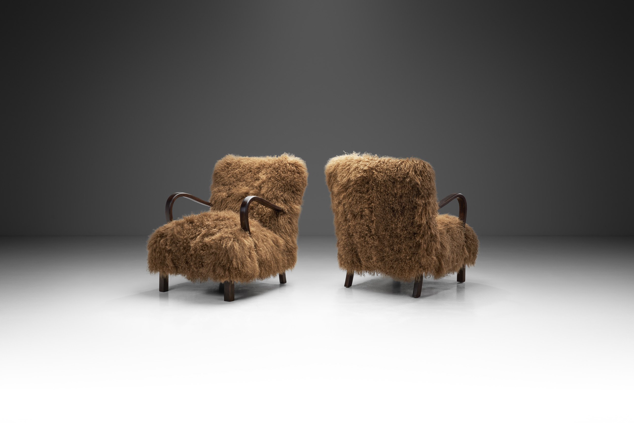 Dating from this period of unbridled creation, this exceptional pair upholstered in Tibetan sheepskin preserves the traditional ideals of European mid-century design, while also utilizing the new techniques the 1950s brought by. These chairs preserve the value and beauty of master craftsmanship and exquisite materials making them timeless, unique additions to any space.
