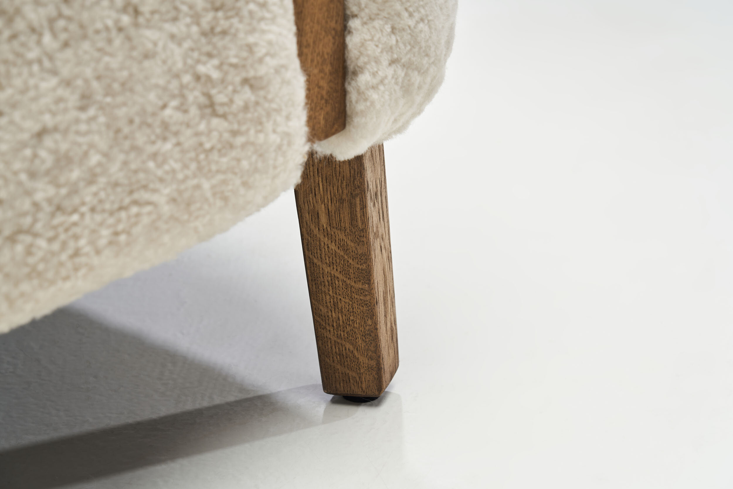 The elegant organic lines of the design create a striking silhouette. Its generous proportions and luxurious upholstery create a visually pleasing look and provide great sitting comfort. The chair’s seat and backrest are separated in a style that is typical of Swedish designer, Otto Schulz. This stylish feature highlights the beautiful oaken frame and show off the cabinetmaker’s expert craftsmanship. The armrests are in an unusual shape, curving outwards, and along with the generous proportions and upholstery, are perfectly sculpted to accommodate the sitter. Schulz was known for his floating back designs as it is seen here, preventing the design from looking heavy. The sheepskin makes this feature even more outstanding, as it embraces the solid structure with its softness. The sturdy frame and armrests are carved from solid oak and have acquired a beautiful patina over the decades.