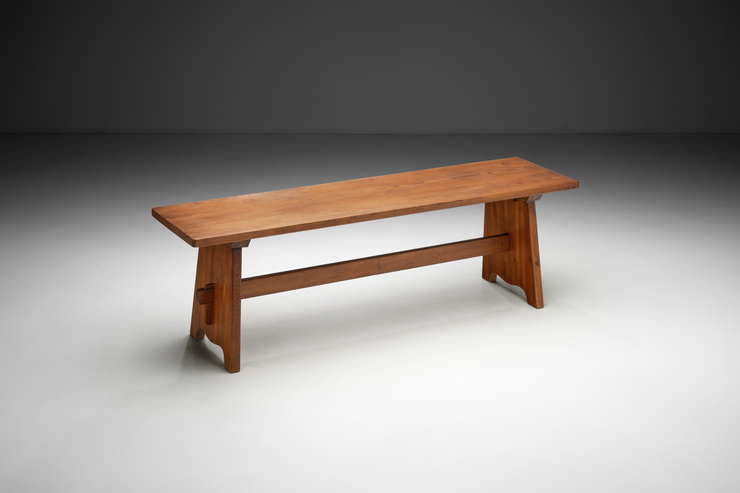 Self-taught, Göran Malmvall was a highly skilled cabinetmaker with considerable technical expertise, and was renowned for the boldness of his innovations. This bench holds a strong expression with its sturdy shape, and organic design, which is dominated by the natural beauty of the material. The neat finish emphasizes the beautiful grain pattern and warm tones of the pine giving the piece a rich, inviting appearance. In this bench the horizontal and vertical lines and surfaces are emphasized with clear edges and simple joinery. The absence of ornamentation is also in service of enhancing the organic, simple look that defined Swedish design of the era. Swedish modern in many ways transcends the word ‘modern’, and so does Göran Malmvall. Like the style, the Svensk Fur pieces can be incorporated successfully into contemporary and traditional interiors alike, lending themselves to a timeless and universal appeal.