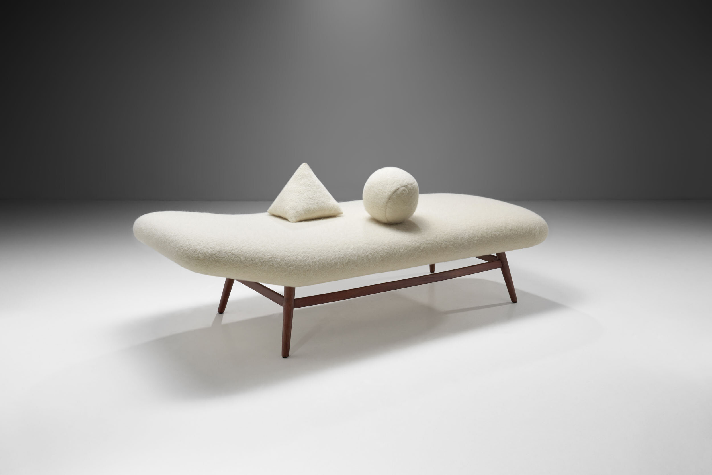 The keywords regarding this model are quality, design and understated elegance. A daybed is the perfect cross between a chaise longue, a couch, and a bed, and could serve all these purposes. The slender, slightly conical legs are made from cherry wood with a beautiful dark shade that attracts the eye. The legs balance out the body well, creating a light, airy look. The elegant shape is formed by the slightly raised back and the round, soft edges. The geometrical pillows are a unique addition that add visual interest and break the flat and straight lines of the body and legs. This daybed is an exceptional piece of post-war German design, and this original model remains very limited in numbers.