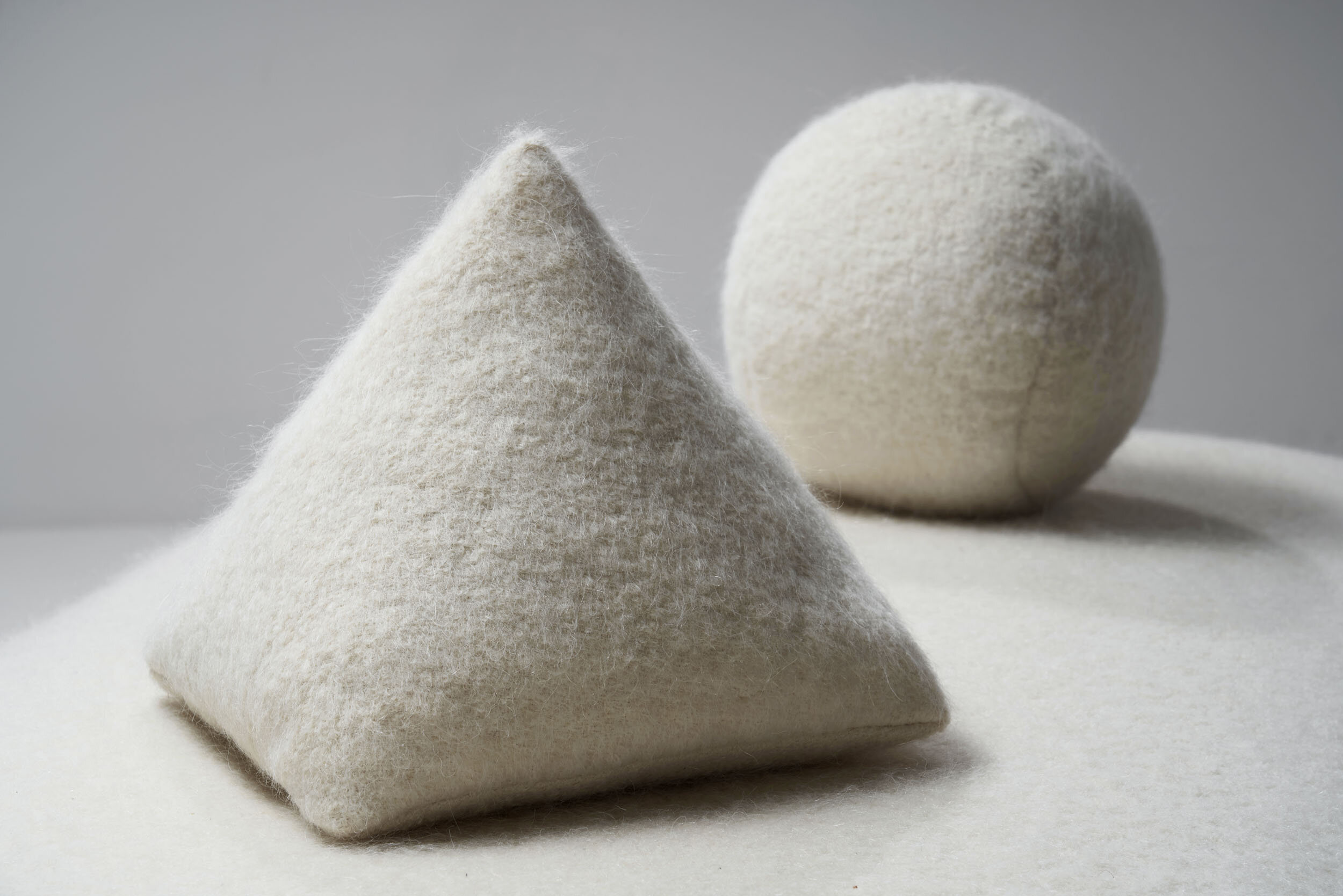 In good vintage condition. Wear consistent with age and use. The chair and pillows have been reupholstered recently in premium alpaca and wool blend fabric.