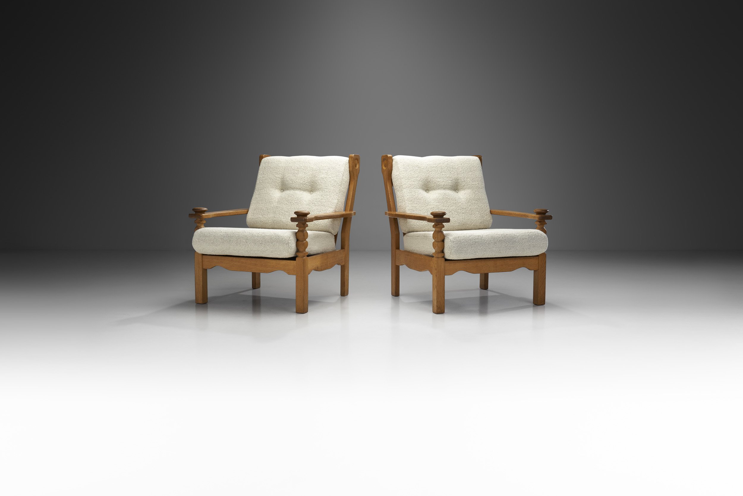 The carved oak armrest supports in the front immediately stand out and define the impression of the design. Somewhat unusually, these chairs feature several, but subtle decorative elements. The conscious use of the dualism of the straight and curving lines is very apparent and shows the designer’s brilliance. Oak is a great “blank canvas” for intriguing shapes and forms, especially under the hands of master cabinetmakers as this pair shows. In Denmark, modernism took a different route than in most other countries; the traditional craft of cabinetmaking played a very important role in Danish Modern. The expert woodworking provides both aesthetic and structural quality, evident in the carved arms and back providing support and the scalloped edges of the back and seat. The front arms supporting the armrests are carved in a way that resembles the Baroque style, yet, Scandinavian modernism remains at the core of the design. Furthermore, the back legs ascending to form the backs assure that the chairs are interesting from every single angle. The solid oak is complemented by the soft, upholstered cushions. The light bouclé is perfect to add textural interest to the otherwise smooth surfaces of these chairs.