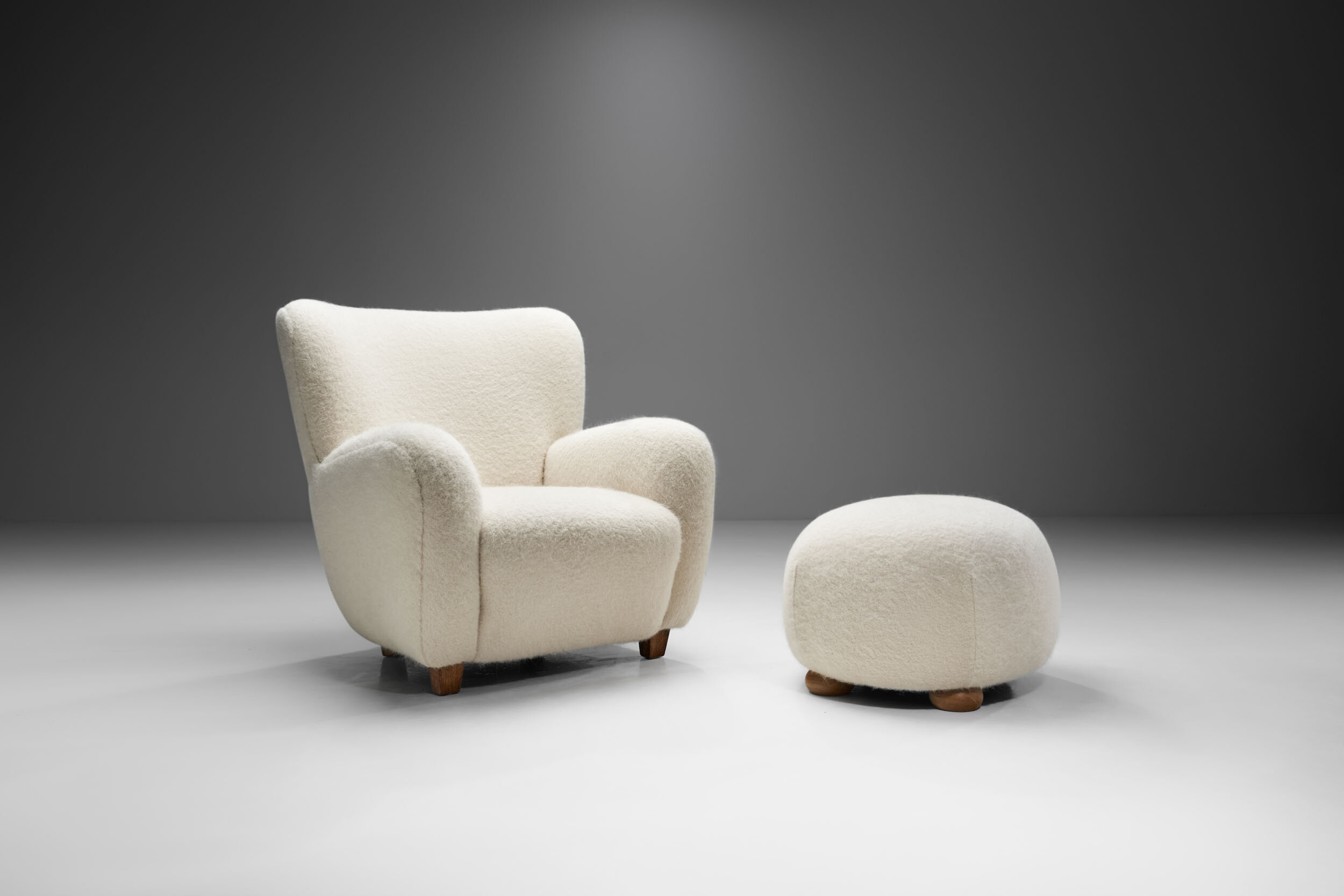 Scandinavian furniture from the mid-20th century revolutionized the history of what we consider modern design today. Scandinavian chairs in particular have become unrivalled references in it. Cabinetmaker lounge chairs may seem similar at first sight; however, each model’s individuality becomes evident upon closer inspection. In this lounge chair’s case, its voluminous shape balanced by the short, wooden legs stand out immediately. Its inventiveness bears witness to the synthesis that this chair has achieved between form and function, in which aesthetics and utility come together in a purely Scandinavian manner. The fully upholstered wooden frame rests on light, stained wood legs. Slim tapered legs support the chair in the back and front, which is very characteristic, especially paired with the ottoman’s bun feet. From the front and sides, the beautiful line tracing is visible, highlighting the gently reclined position of the back. We have added a newly produced matching, upholstered ottoman to provide additional comfort and visual interest.