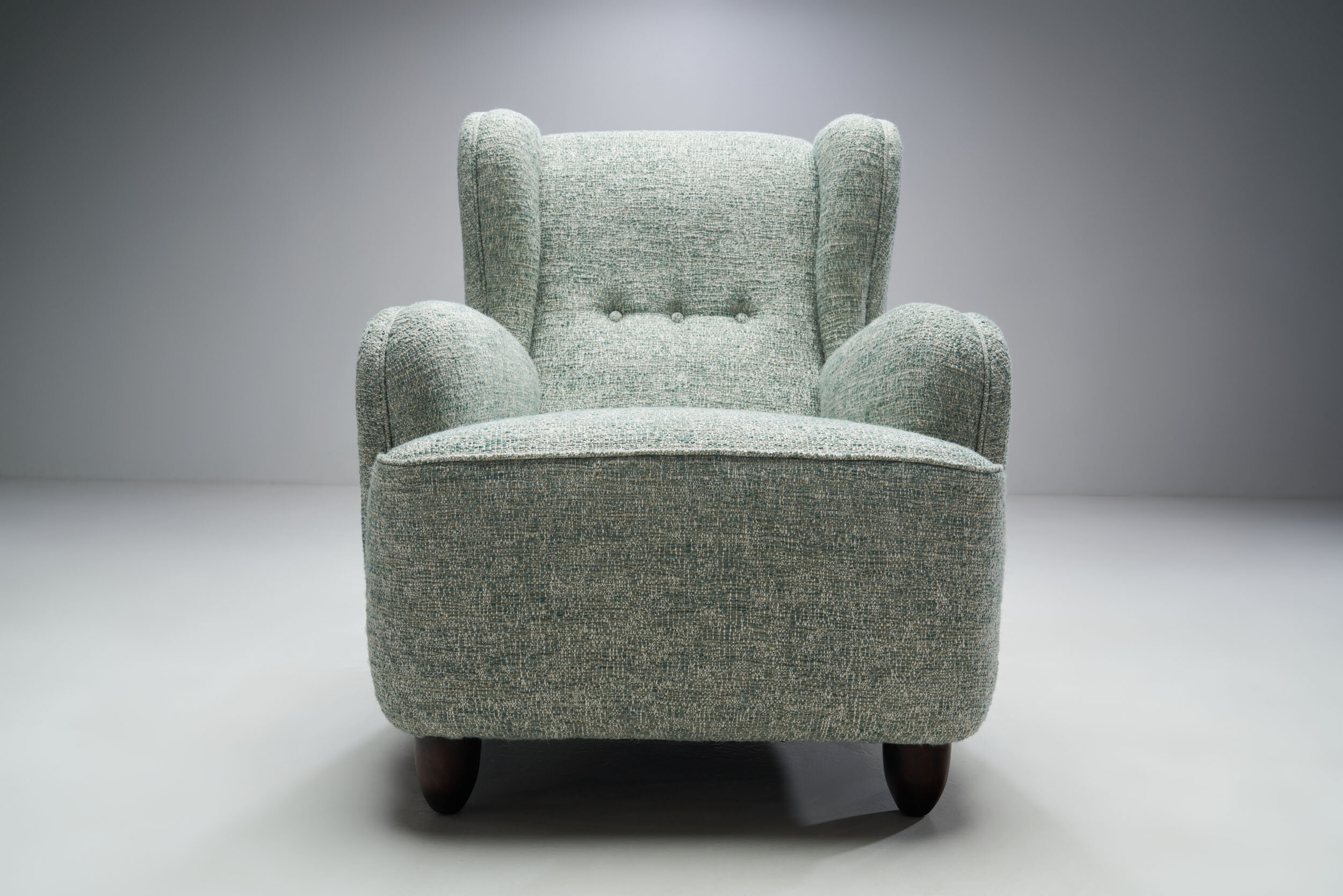 What immediately stands out in visual terms is the voluptuousness and elongated seat of this model. The embracing silhouette is further enhanced by the armrests and the “wings” on the backrest with similarly shaped curves. In Scandinavian design, emotional warmth is never designed out of the picture, as it can be in the more austere reaches of the industrial inspired Bauhaus aesthetic. That warmth here is expressed in the colour, pattern and texture of the upholstery, in the organic form, and the generous size. There is an undeniable human quality to the design that offers psychological warmth. The front and back legs differ in their shape, and add the quirky quality to the design. The dark, stained beech legs in the back serve a more functional purpose, to support the body’ stability, therefore they are tapered and gently bent. The front legs serve a more aesthetic purpose, and complement the curvature of the body. The greenish bouclé fabric pairs beautifully with the dark colour of the wood, while also highlighting the lines and angles of the design.