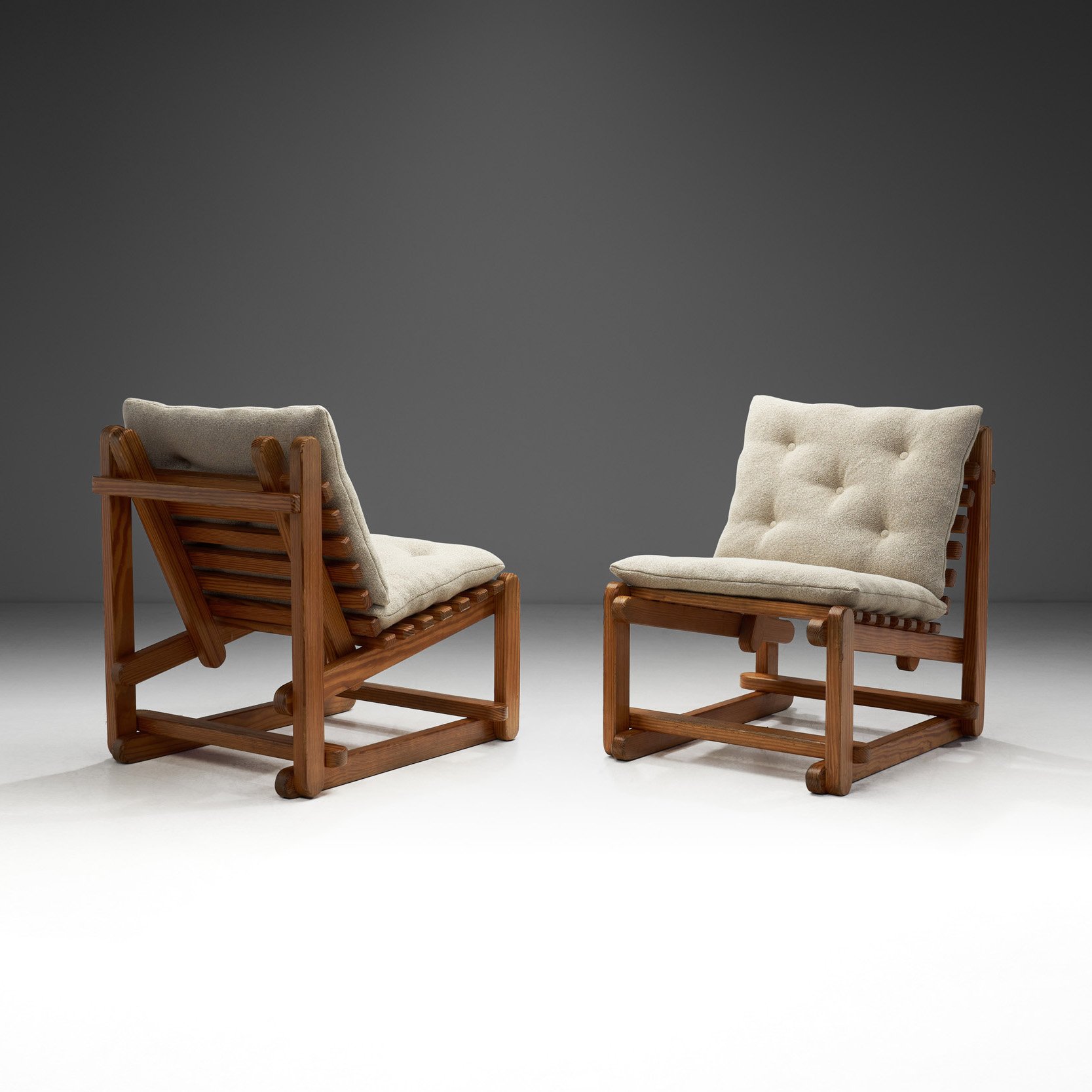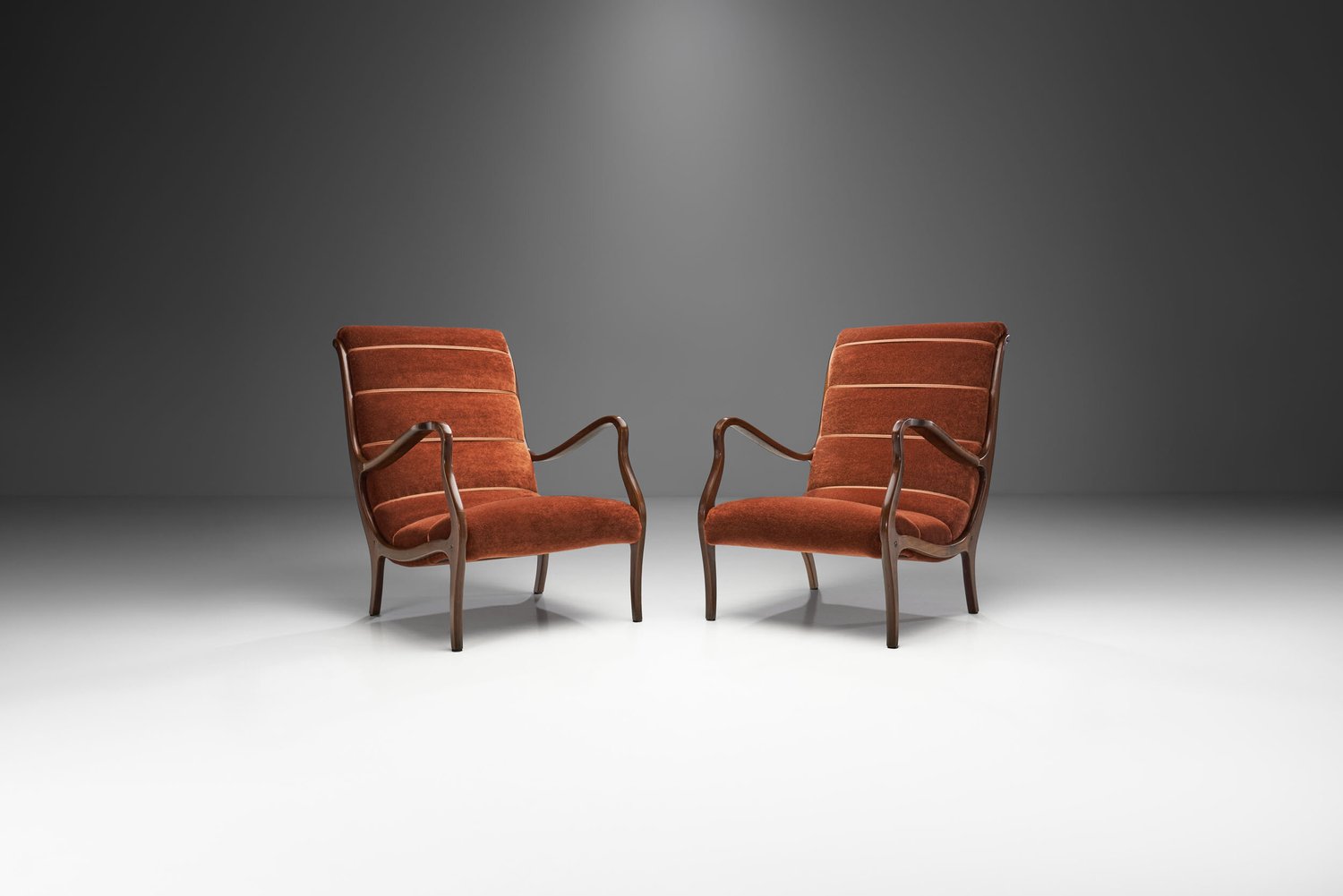 This pair of ribbed-back chairs has a fantastic retro feel and look to it, enhanced by the colour scheme and materials. The wood is elegant, timeless, natural, and strong. Yet, it still offers plenty of durability and in this case, defines the curves of the armrests and backs beautifully. The gently bent back, the ribbed seat and back cushions, and the widening armrests are all in service of the ergonomic design, which was evidently of utmost importance to Longhi. Every single line is well-thought-out, and the joinery is seamless. This does not come as a surprise, since the Lombardian designer was a trained cabinetmaker and architect, and the son of a woodcarver. This pair embodies the classical elegance of Italian mid-century furniture, and the artistry and craftsmanship of Ezio Longhi, who was the founder of the Elam (acronym for Ezio Longhi Arredamenti Moderni) furniture brand.