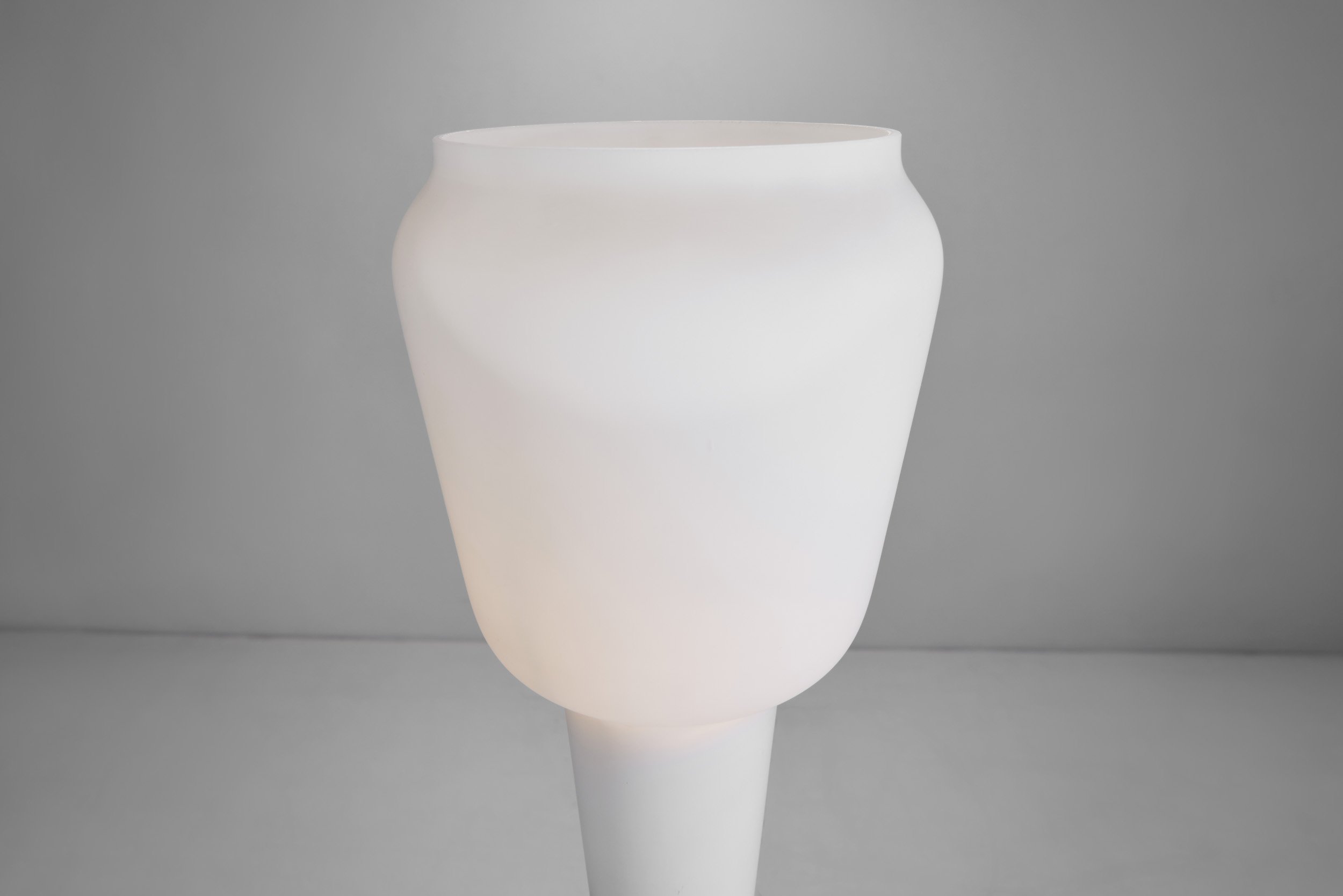 While the design of this unique floor lamp offer plenty visually, it is still uncluttered with sleek lines with both organic and geometric forms. The dual lamp construction immediately stands out, with one straight, upward facing lamp and another, downward facing with a more organic, curving look. There are numerous unique solutions, from the way the opalescent shades are connected to the tubes, to the way in which the lower lamp’s body parts to embrace the other’s tube. As a result of the latter, the black lacquered metal structure of this floor lamp gives an organic impression despite its material. The shape of the shades add to this aesthetic, while the bodies and tripod base with brass tips keep the design in the mid-century modern vein. The lamp creates an atmospheric lighting, the light shines through the opalescent bulbs in a cosy way.