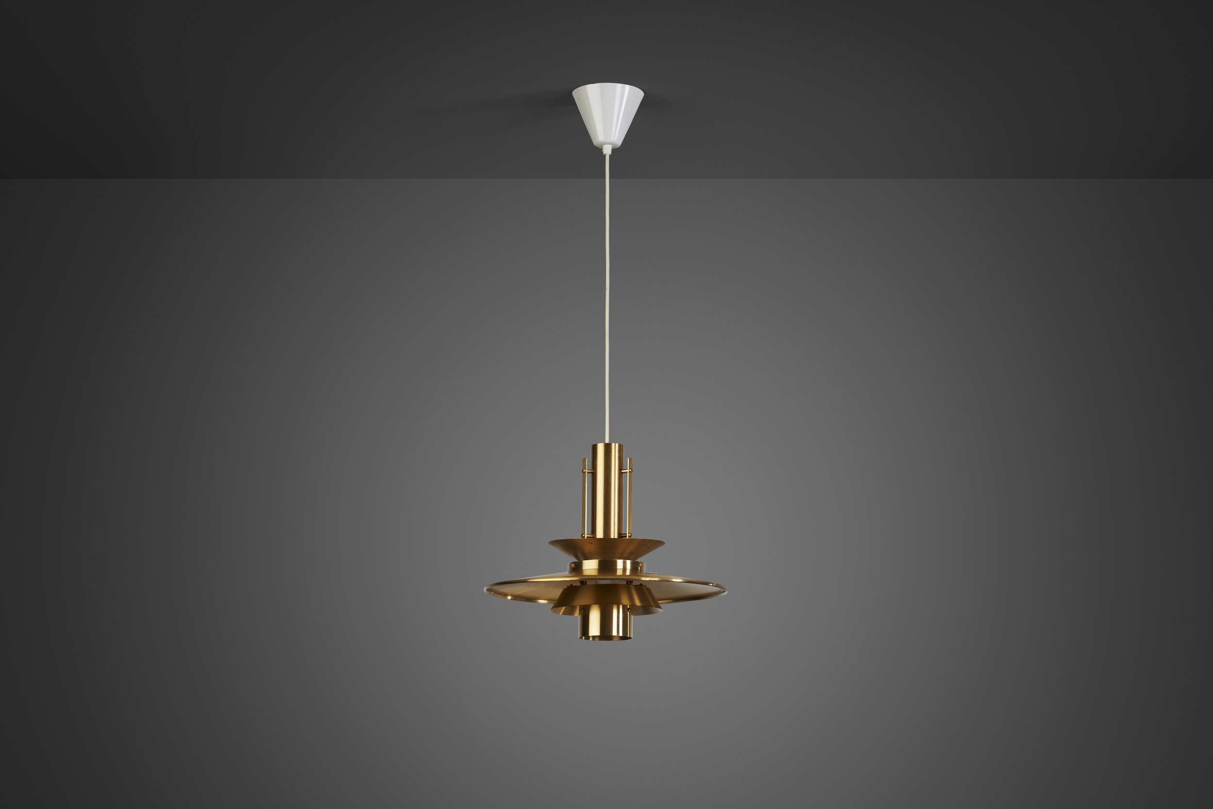 The 20th century - especially of the mid-century era - laid out the foundations of the idea that good lighting is a combination of shape and function. Above all else, Danish design is thought through to the smallest element as this pendant light exemplifies it. This model, much like the designs of Poul Henningsen, was developed during the 1960s, likely in response to the constant changes made to the shape and size of incandescent bulbs by bulb manufacturers. The distinctive multilayered construction is made entirely of solid brass with a polished surface that results in an intrinsically mid-century modern look. The graduated tiers and their individual shapes define the design, with five separate parts. What differentiates this model from the similar layered contemporaries, are the vertical cylindrical parts that frame the tiered plates. While they have a functional role, the aesthetic role they take on is just as important as they add straight vertical lines to the larger horizontal plates thus balancing out the design. The pendant emits a lateral light as well as illuminating itself, providing a soft radiance from within its core. The warm hue of the brass is accentuated on multiple parts of the lamp thanks to the smart position of the lightbulb. This pendant light hangs from the ceiling suspended by a white cord that cleverly contrasts to the brass to highlight its material qualities.