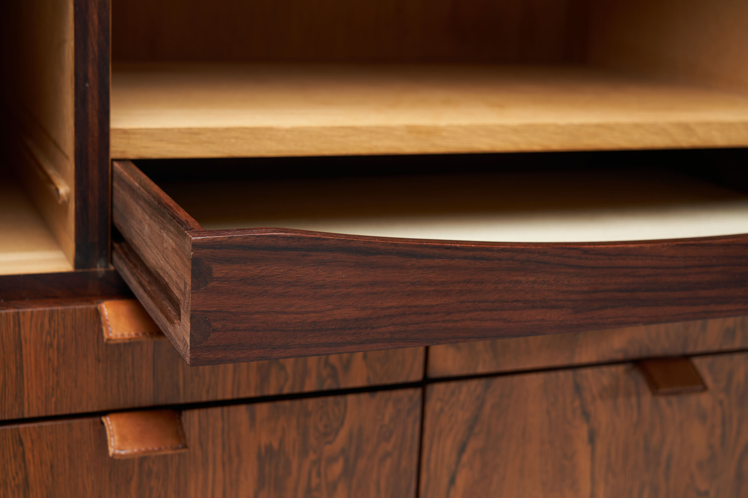 The cabinet is made of Brazilian rosewood with an oak interior featuring two shelves and three trays behind two doors. The four bottom drawers of different sizes provide additional storage space. Uniquely, the handles are made of brass and are covered with patinated natural leather. The four slim legs have aluminium profiles and wood detailing. Together with the bottom part of the body, they give a sculptural look the cabinet.