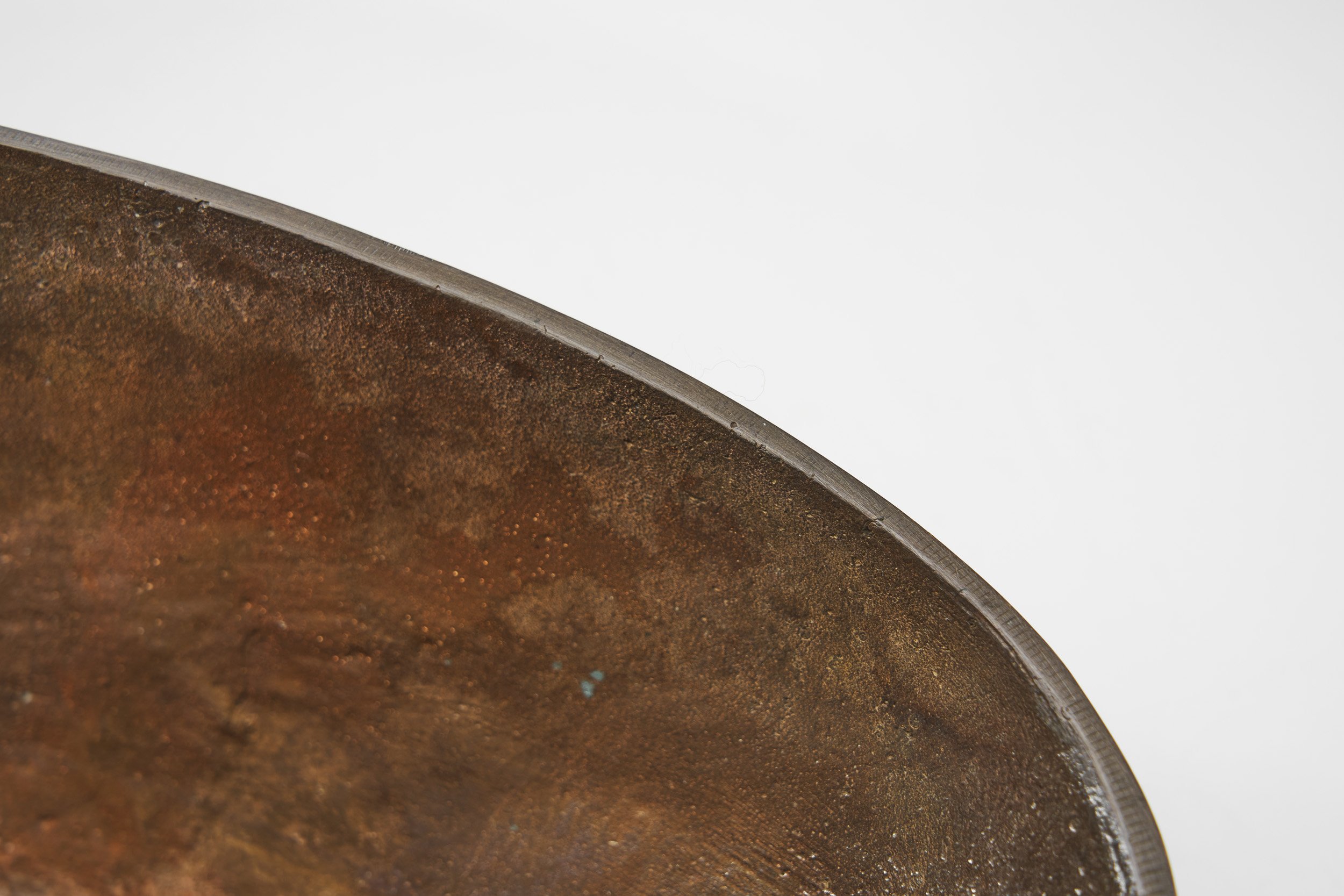 The artist kept the forms of his creations simple with minimal embellishment, staying true to the original texture and form of the material. This is the case here as well, as this bowl has a simple, but distinctive shape with two half-moon shaped indentations across each other. Like most of his creations, this bowl was also created with the use of the so-called Yamagata casting. In the middle of the Heian era (794-1185), a number of battles took place in Yamagata in an effort to quell various uprisings. Armies included metal casters who discovered that the sand in the city’s river and the soil were ideal for casting. Some of these casters later settled in the area and became the founders of the Yamagata metal casting tradition. During the casting process, firstly the overall design is decided, then the cast that will form the outer shape is made from local materials, including sand and pebbles. Japanese washi paper is used to make a stencil of the design, which is drawn onto the cast and carved. Next, the inner cast is set within the outer cast, and molten iron is poured inside. Finally, after the iron has set, the cast is opened, the metal is removed, and the surface is tempered. In a wabi sabi manner, the bowl is not aiming for perfection, instead, it relies on its textured surface with differences in colour and lineament.