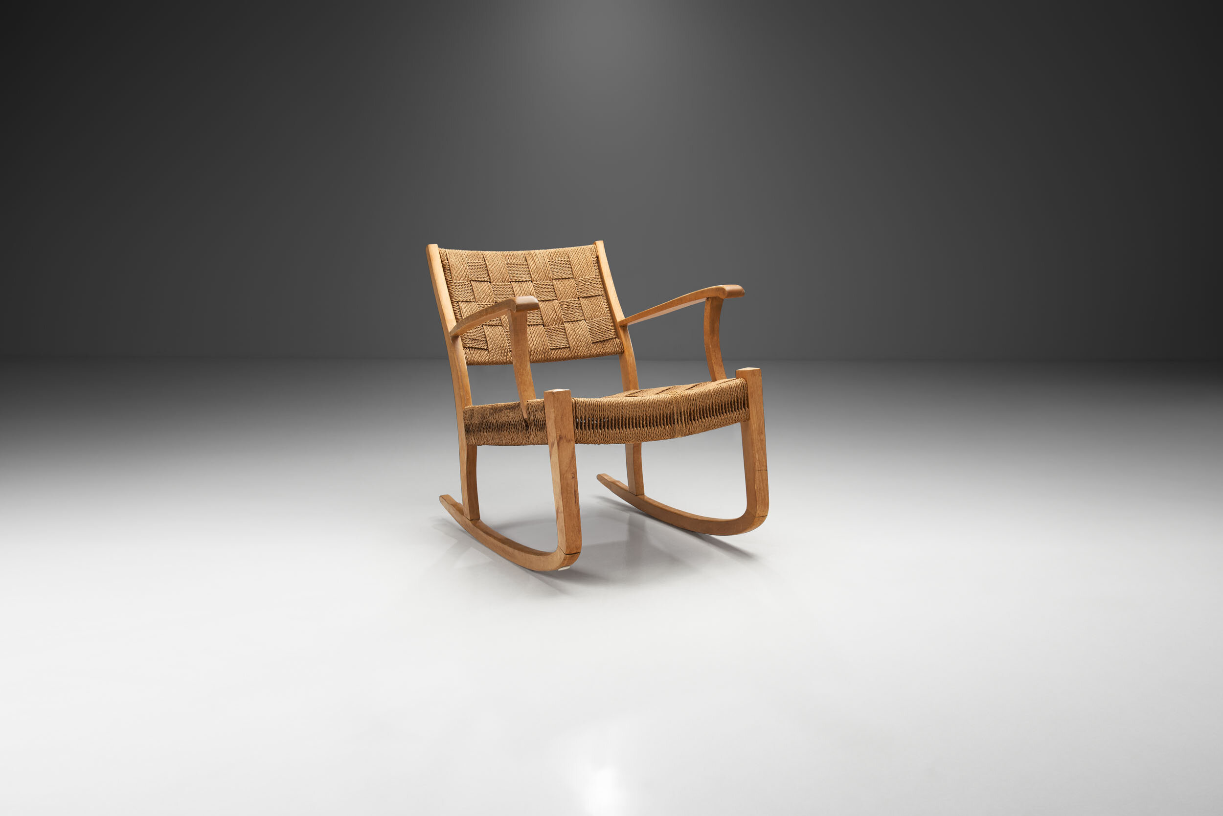 A beech rocking chair, suspended in seat and back with woven paper cord. Twisted paper cord woven across an open wood frame has been used to form the seats of Danish chairs since the 1940s but through the 1950s and 1960s paper cord became perhaps the most distinctive and, for some people, the type of seat most closely associated with chairs from the Danish Modern period.