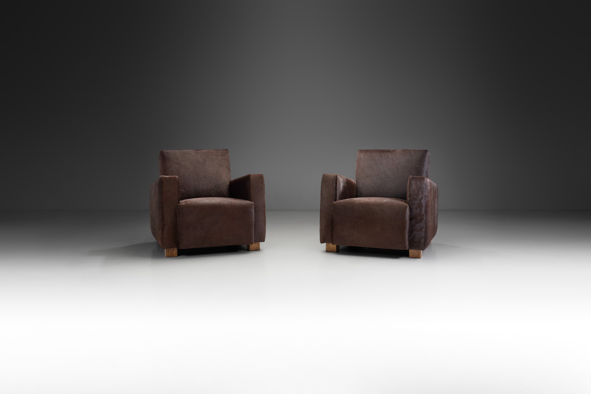 The chairs of this pair are gracefully resting on four tapered, solid wooden feet. The strong lines and proportions of the chairs are perfectly balanced with the short feet. Like the legs, the bodies of these chairs are squared as opposing to the predominantly rounded lines of later designs. This angular style is reminiscent of the Art Deco and provides elegant lines. The armrests point slightly upwards, while the backs are softly tilted, creating a modern and welcoming look. The arms are connected to the backs seamlessly, fulfilling the fundamental design principles of exceptional sitting comfort and that the models must look good from every single angle. Quality craftsmanship was evidently of optimum importance for the cabinetmaker who created these chairs. The element that truly elevates these chairs is the upholstery. The cosy, dark long hair of the fabric is exquisite and matches the design’s straight lines very well.