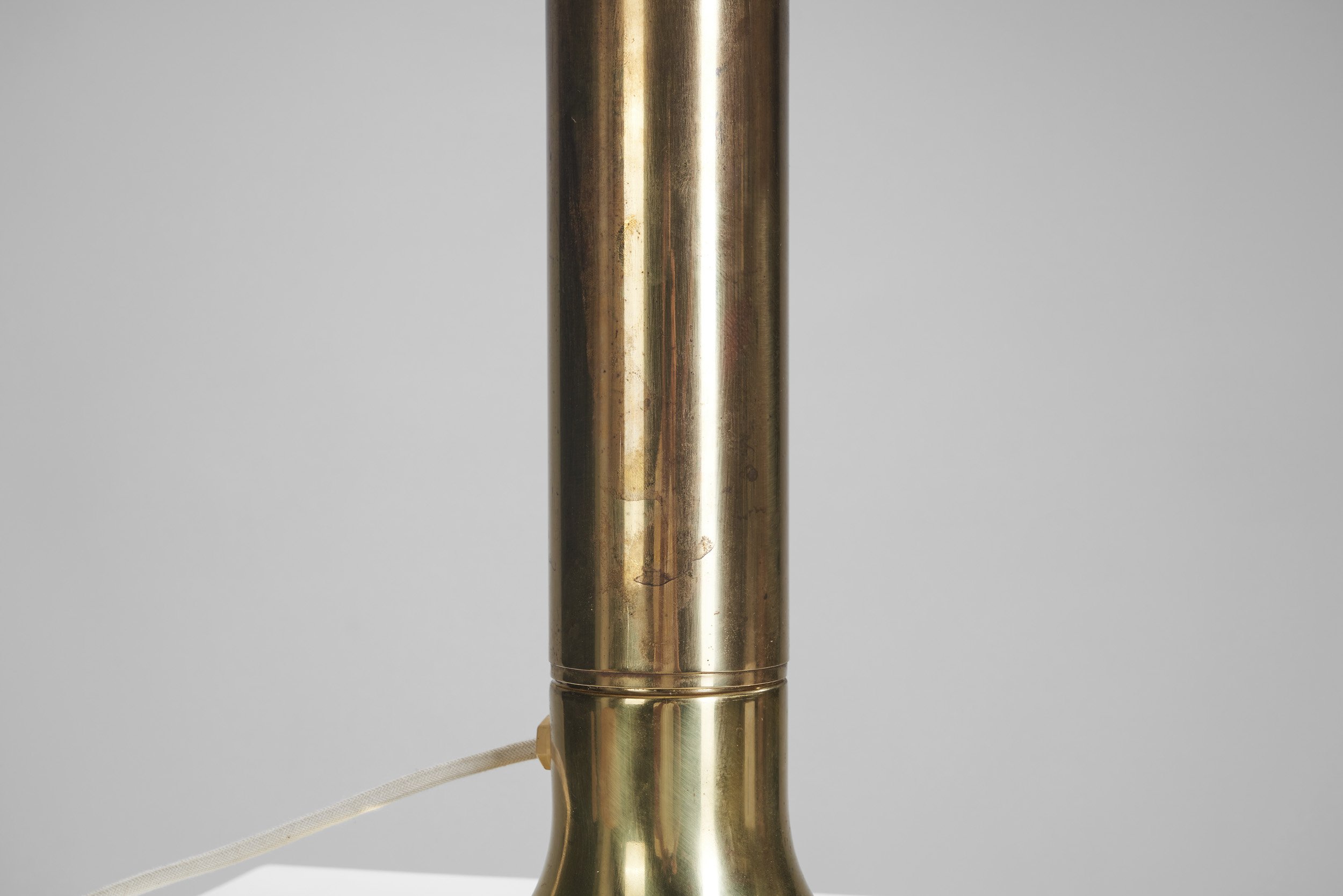 The use of brass was widespread throughout Scandinavia during the mid-century era, and Jakobsson most memorable designs are mostly composed of the material. In this case, the base and thick shaft are purely brass, combined with a less common material, perspex glass. The use of acrylic glass was still fairly uncommon in the 1960s, showing the Swedish designer’s forward-thinking design skill. The material is a polymethyl methacrylate acrylic sheet which is manufactured from methyl methacrylate monomer, and is lower density and lighter in weight compared with glass. Additionally, the clear sheet offers excellent optical clarity which is why it is used here as well. The resulting look is similar to milk glass and contrasts beautifully against the golden hue of the brass body. The brass shaft reaches up high, over the plastic shade, which creates a neat look. The shade is composed of two different parts, the white acrylic plastic curved top and a layered lower part composed of rings gradually increasing in size to diffuse the light. The design is completed when the light is switched on, dressing the brass in a golden yellow hue, creating a cosy dimmed light that is especially atmospheric.
