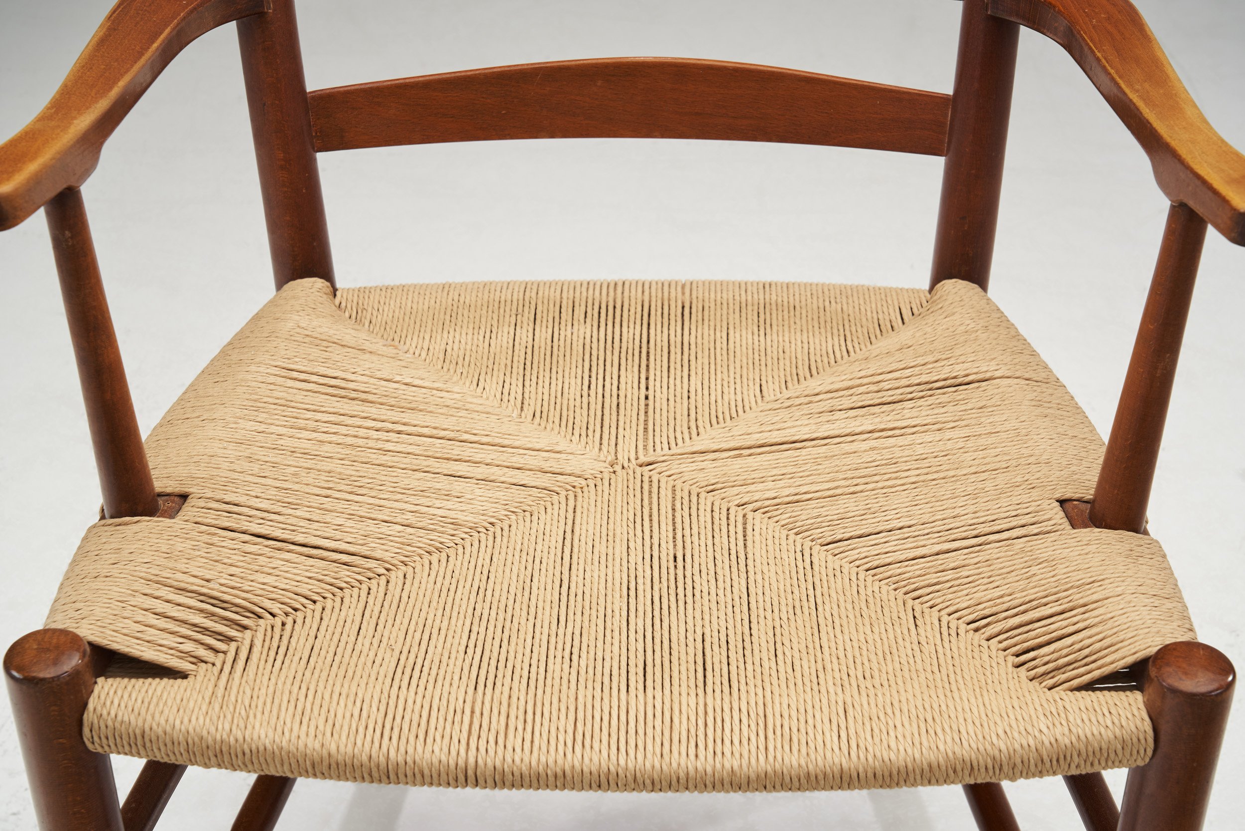 Made of beech and Danish paper cord, these chairs are true icons from Kaare Klint, recognized as the father of modern Danish furniture design. The Bethlehem Church, for which these church chairs were designed, coincidentally was the first Danish church to use chairs instead of benches. Besides the historical value, this pair also possesses a design that is Danish at its core: organic materials, the clean lines of Modernism and the clear-eyed practicality of Functionalism. The style is clearly influenced by the Shaker style, simple but well-proportioned and well-made furniture. As seen on this Klint’s design, these chairs usually had spindles and a high back of the type usually called a ladder back, but on the Danish versions, the cross pieces of the back rest tended to be thin but flat, curved and shaped pieces of flat wood rather than spindles or rungs. Similarly to its Shaker predecessors, decoration is kept to a minimum on these chairs, instead, the materials - especially the woven paper cord - and the beautifully crafted functional elements serve a double purpose. The straight cross rails and stretchers between the legs balance the gently curved backs, while the beauty of the beech wood is complemented by the organic paper cord comprising the seats.