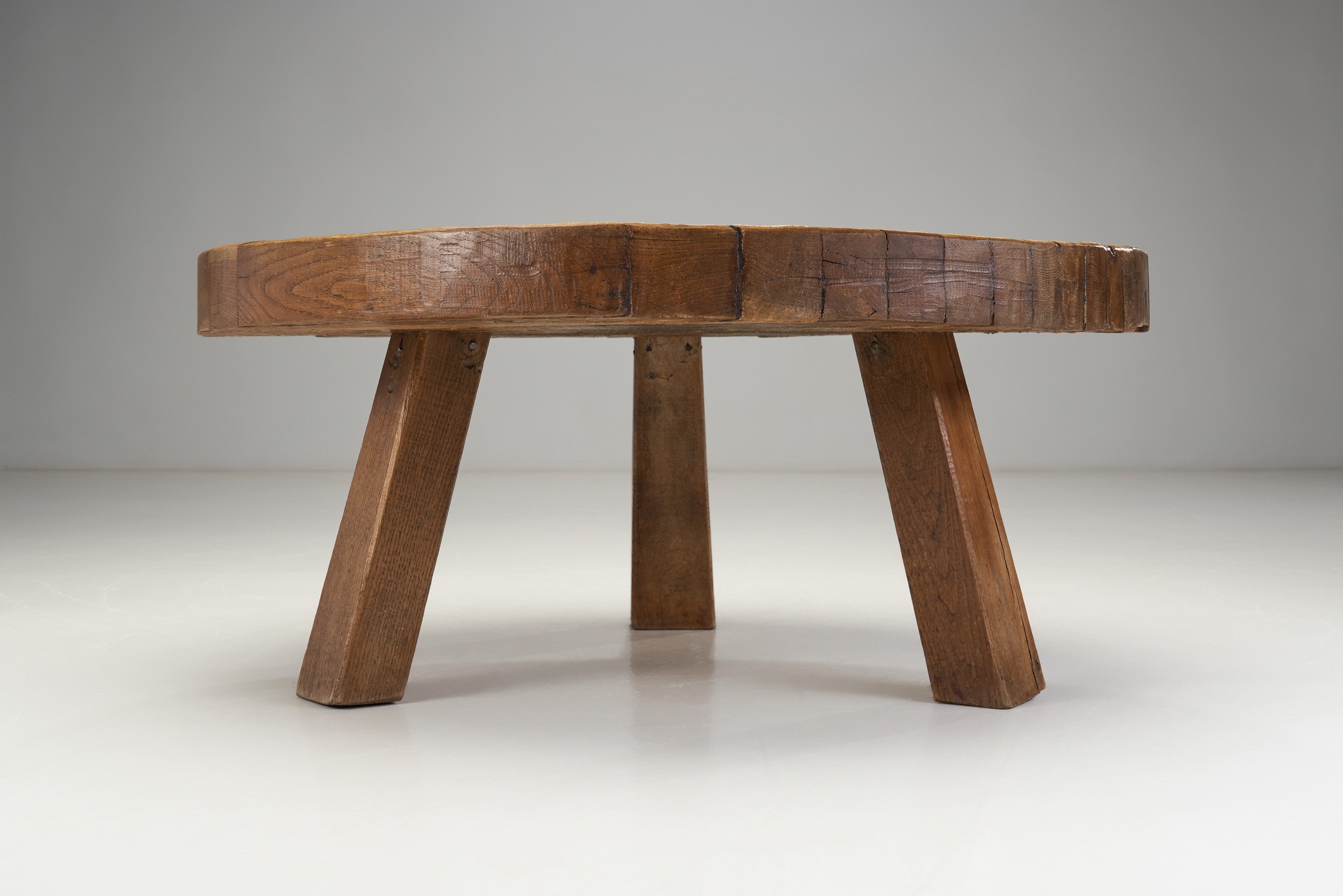 Organic design can successfully blur the lines between the “man-made” and the natural environment. As this low coffee table shows, this is achieved by leaving the focus on the material without altering it too much. The beautiful qualities of the oak remain the defining aesthetic feature. The mid-century modern design movement represented a break with the traditional past, rejecting the pseudo-historical use of ornamentation. In comparison, furniture of the era is generally more pared-down and uncluttered with unnecessary decoration. Taking cues from nature, this coffee table has a strong elemental feel to it, which is a result of its thick round tabletop and sturdy legs. The simple design serves the purpose of showing the understated beauty of natural materials and their endless possibilities under the hands of an expert craftsman. Furthermore, oak is an especially durable hardwood that is extremely multi-faceted with a beautiful grain and texture as seen on the wide tabletop. The cracks elevate the rustic look, while the height perfectly balances out the thickness of the wood.