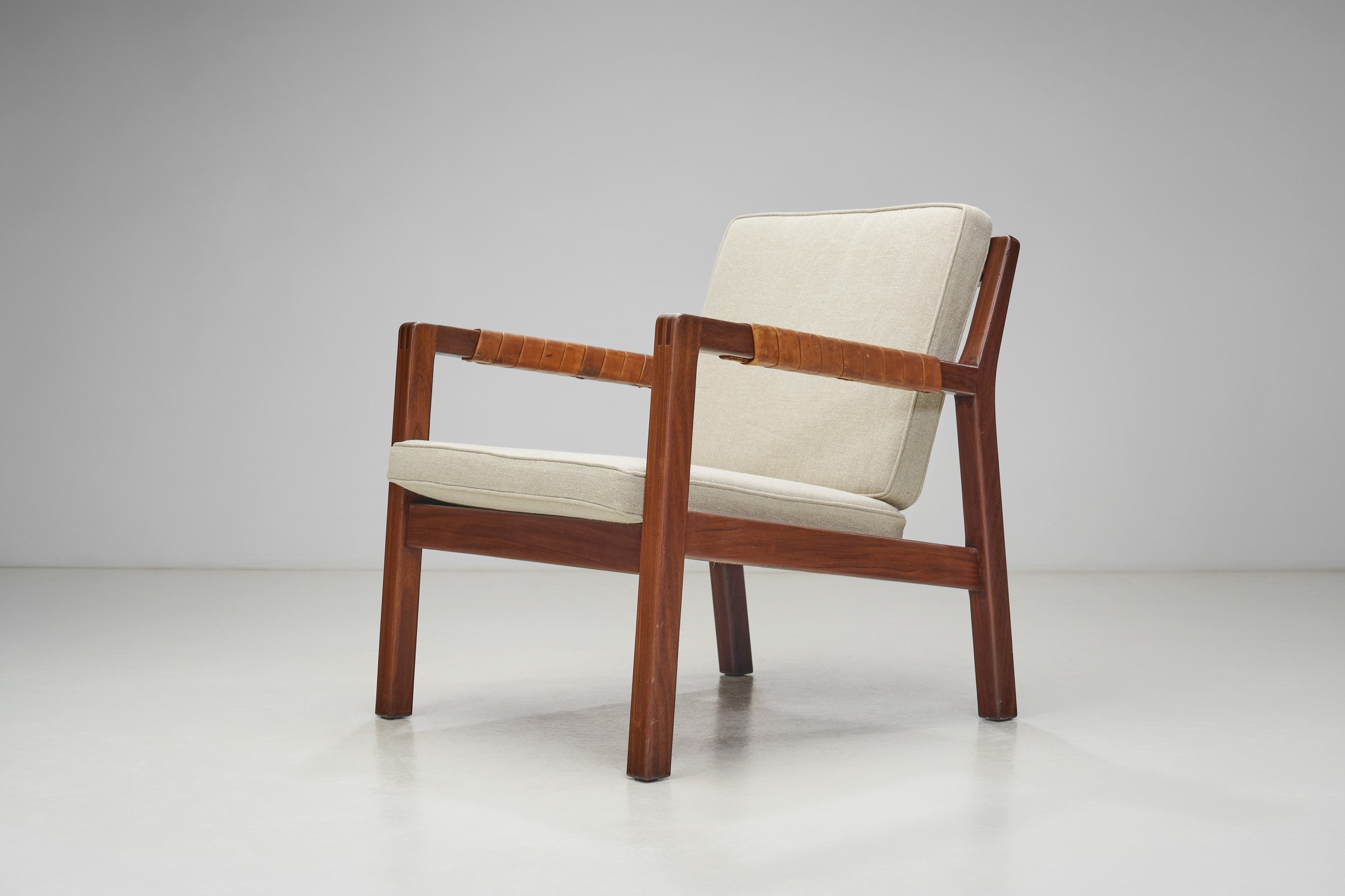 The main design element is unquestionably the leather back that is expertly woven in a cross pattern, standing out against the light upholstered square shaped back cushions. The simple, geometric wooden frames crafted from high-quality wood have a minimalist and timeless elegance. The clean lines and precise angles are hallmarks of Nordic design, reflecting the region's affinity for functional beauty. In this chair model, the streamlined geometric lines of the wood are the perfect frame to showcase both the cushions and the gorgeous back. Hiort af Ornäs was particularly firm about two things regarding his chair designs: the sitting comfort and that the model must look good from every single angle. Much like the “Pedro” model, this pair of ”Rialto” easy chairs easily fulfils these principles, as even from the sides, the design showcases the expertly carved wooden structures and their lightly raised profiles. The removable seat and back cushions, framed by the open bodies, ensure the sitting comfort. The craftsmanship and quality of Hiort af Ornäs is very visible in this pair of easy chairs. This model was designed in 1955-56 and was already exhibited in Milano for the XIth Triennale in 1957, evidencing its then contemporary success.