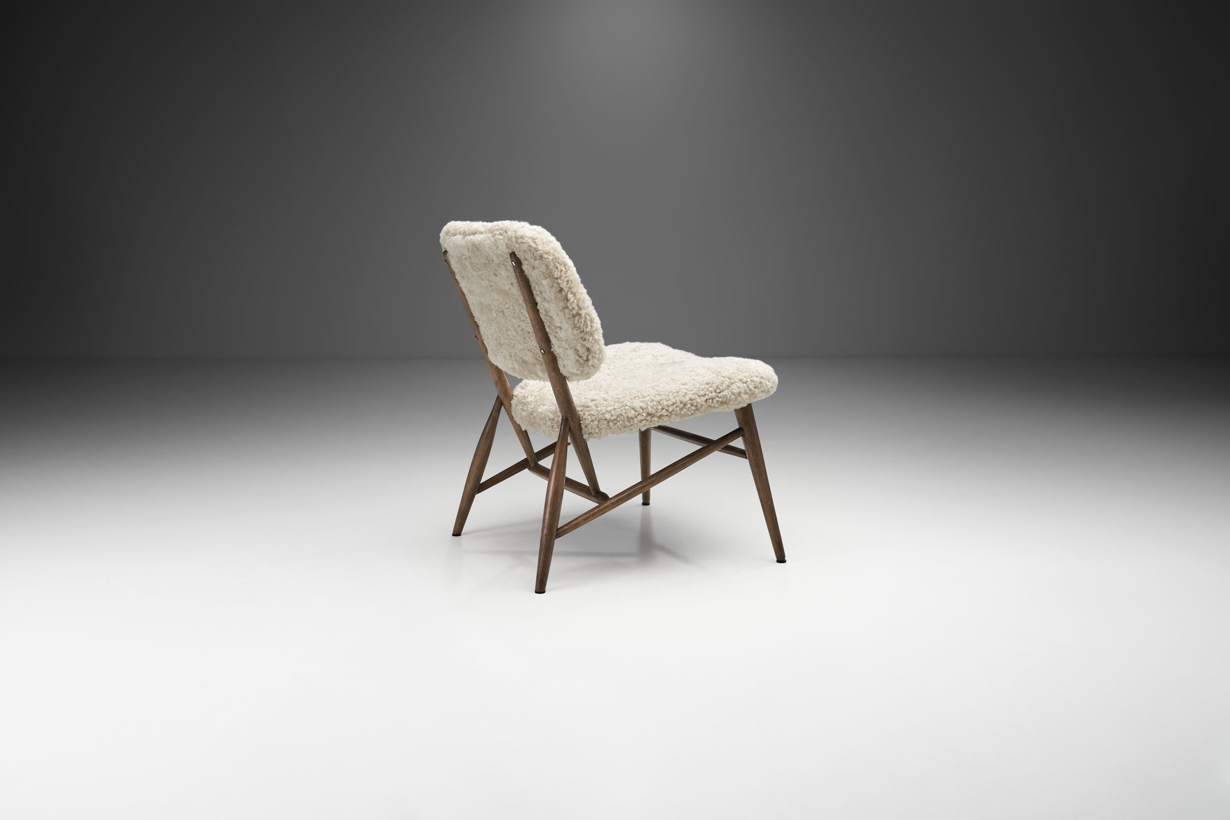 This chair is a piece that is designed in the “typical” Scandinavian modern style. The chairs’ simple and functional design, starting from the wooden frames’ symmetric lines to the visible joints and screws, is highly representative of the principles of Scandinavian mid-century design. The wooden structure is very impressive, and shows architectural prowess. Every element is necessary and starting from the gently spread-out legs to the tilted back, the design assures stability and comfort. The wooden frame appears to be firmly holding the back- and seat rest, which is even more apparent thanks to the soft sheepskin upholstery. The sheepskin further highlights the round edges of the seat- and back rest, and contrasts nicely with the otherwise straight lines of this model.