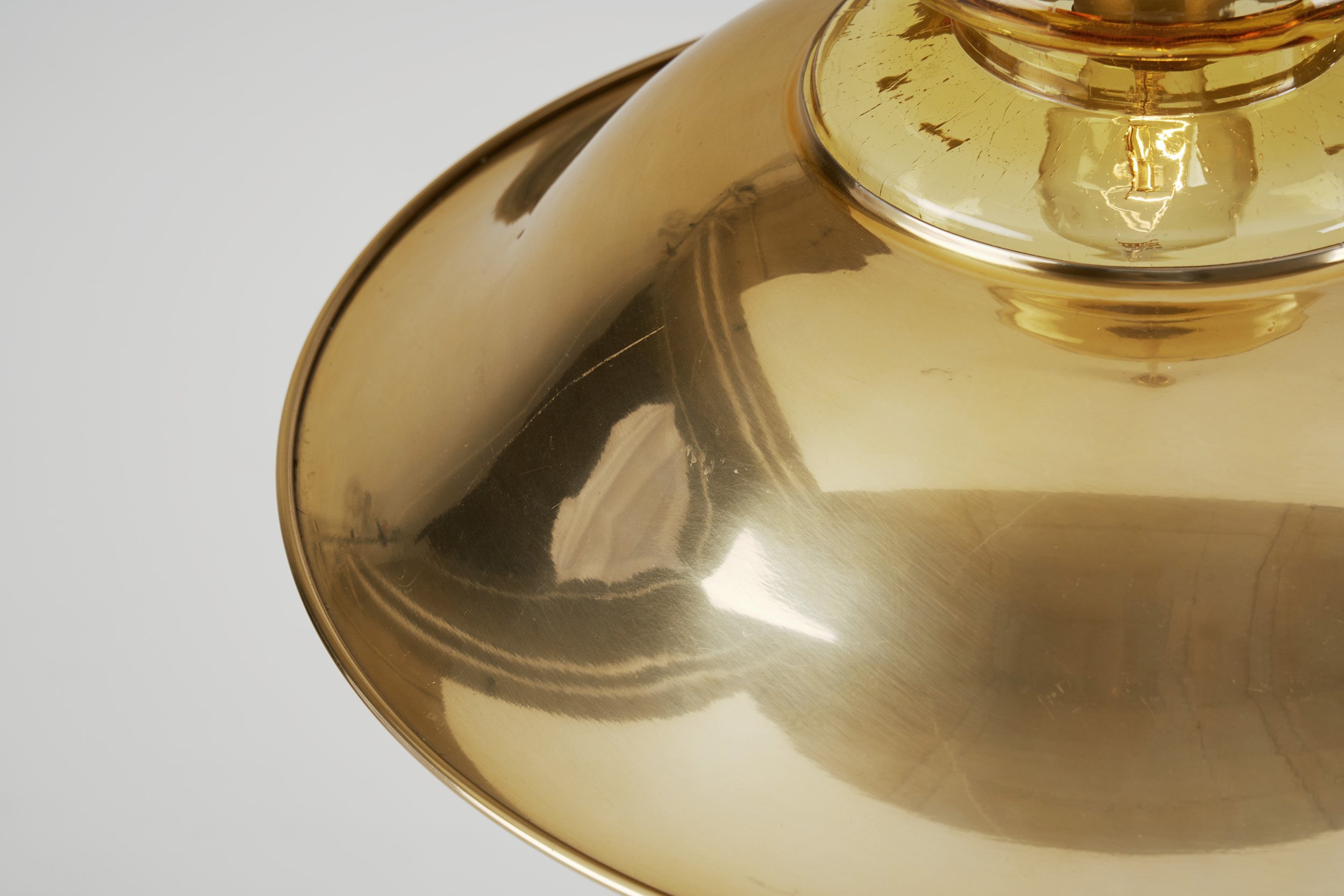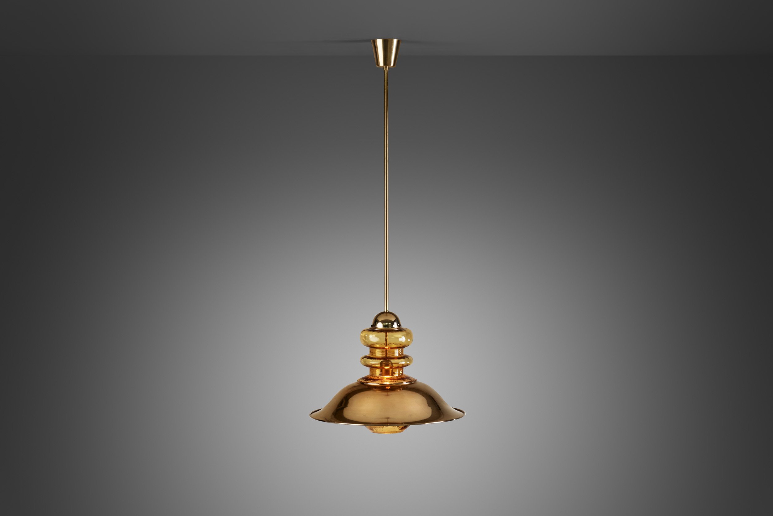 The design of this model is defined by the pairing and interaction of its materials: brass and amber glass. It has the functional and stylish characteristic of mid-century modern models, employing the blown, patterned amber glass to distinguish it from its contemporaries. Many modern lamps, especially from the 1960s, were created in response to the constant changes made to the shape and size of incandescent bulbs by manufacturers. Thus, larger shades accommodating various types and sizes of bulbs became popular as seen here. This pendant features a sculptural, multi-layered body made from glass and brass with a beautiful yellow hue on the outside. While the brass shade, rod, and canopy are very attractive, the glass dictates the overall look. Framed by the brass, the distinctive shape and pattern of the glass creates an almost futuristic look that is even more pronounced when the light is lit. When turned on, the warm hue of the amber glass and brass is accentuated, making the whole lamp glow. The brass shade is matte on the inside, while the rod has a straight, smooth look, details that cleverly balance and also accentuate the eccentric body by creating contrast.