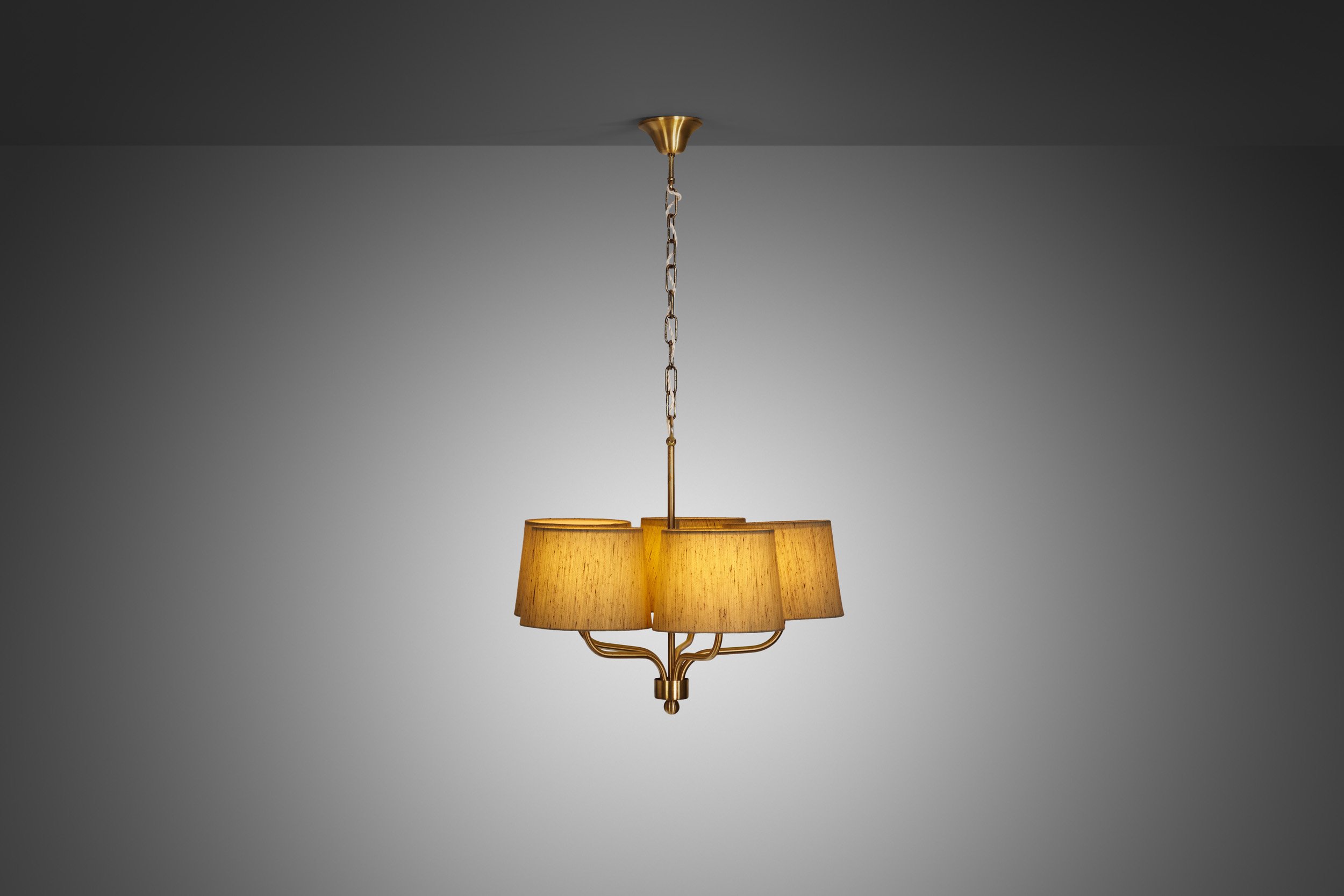 Five Arm Brass Chandelier with Fabric Shades by Luxus Vittsjö, Sweden 1960s (sold)