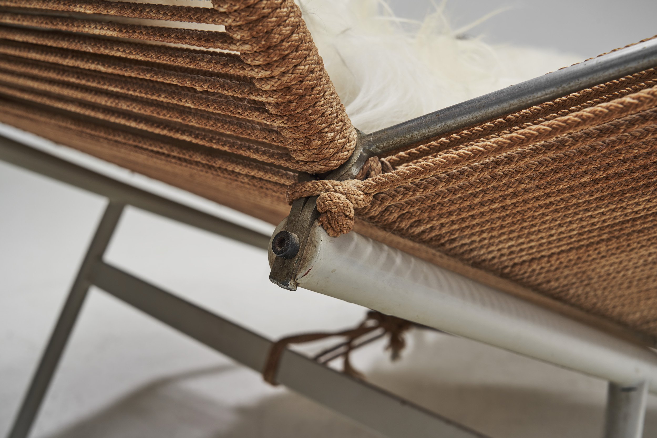 The Flaglinestol or Flag Halyard string-wrapped lounge chair quickly became a 21st-century icon. The story goes that in 1949 Wegner was at the beach, digging himself into the sand when he found the perfect lean-back position for seaside repose, which inspired him to make it in something more sturdy. This gave birth to this chair with its famous steel frame wrapped in rope commonly used for flagpoles. The ergonomic, spaceship-like form still looks innovative despite being over 70 years old. The bottom frame is made of a white-varnished steel structure with beechwood leg caps. The legs are splayed with the front ones connected by a stretcher, establishing the firm base for the body. The top-frame is made of chrome-plated steel that serves as the frame for the stretched halyard. Halyard rope, or flagpole rope, is traditionally used to raise and lower a flag on most external halyard flagpoles. The unusual combination of materials is continued by the cognac leather head pillow secured to the back. The chair is cosied up with sheepskin that - along with the headrest - softens the industrial shape of the steel.