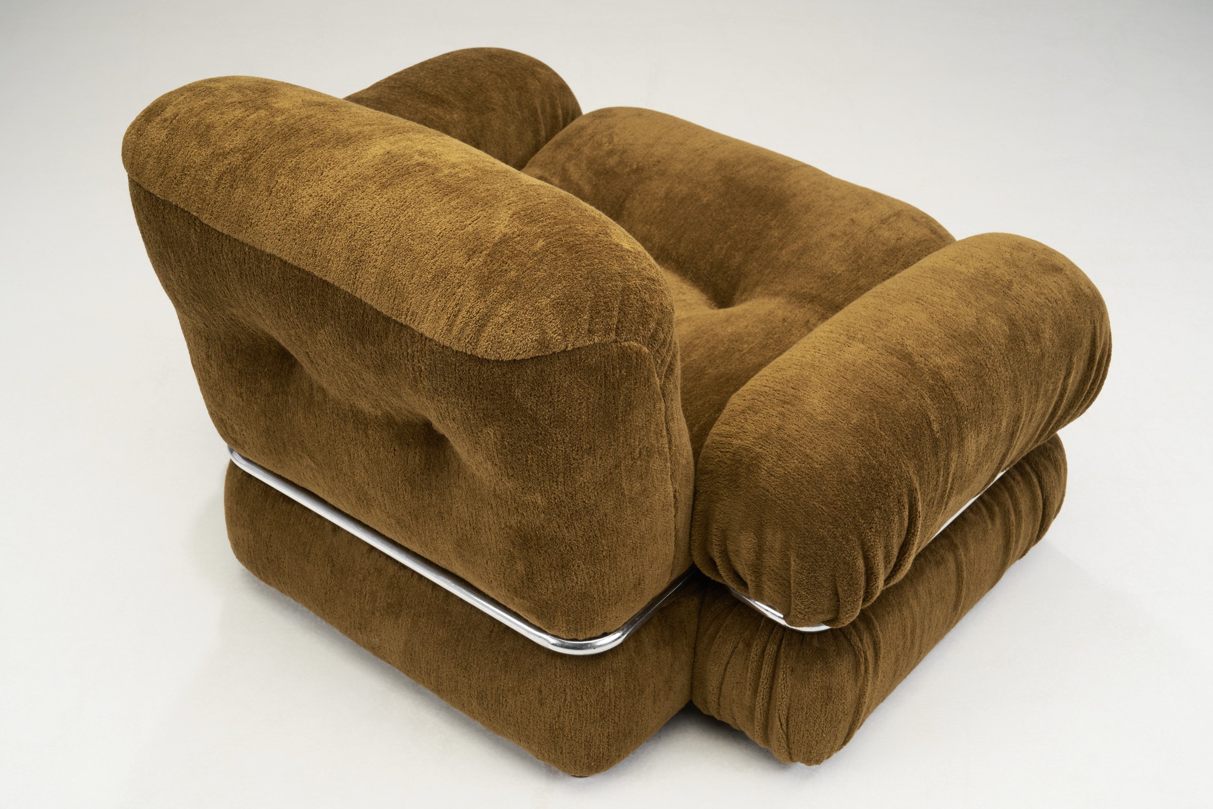 Following the economic boom of the 1950s, the motto “design dictates, users follow” was the matrix of mass consumption society in Italy. Against this idea, the artists, and designers of the coming decades defended a conception of design as an ecosystem that stressed the notion of play within everyday life. As a result, now iconic design were created, such as Adriano Piazzesi’s similar armchair, the “Sacco Bean Bag Chair” by Piero Gatti, Cesare Paolini, and Franco Teodoro in 1968, and Joe Colombo’s “Tube Chair”. These upholstered chairs are much in the vein of these models, showcasing a break from the strictly functional, often rigid forms of the era. The defining feature of this model is the large upholstered body with a structure in chromed tubular metal and wood. The design expresses stylish playfulness and comfort by using a whole bundle of fabric held by the single line of chromed tube. It sinks into the fabric effortlessly, while providing contrast both in material and colour. The chairs’ aesthetic is further enriched by the ruching on the sides and the tufted buttons, both on the front and the back of the back rests. The legs showcase the beautiful wood the structures are made of. Their rounded shape complements the overall gently rounded impression of the design.