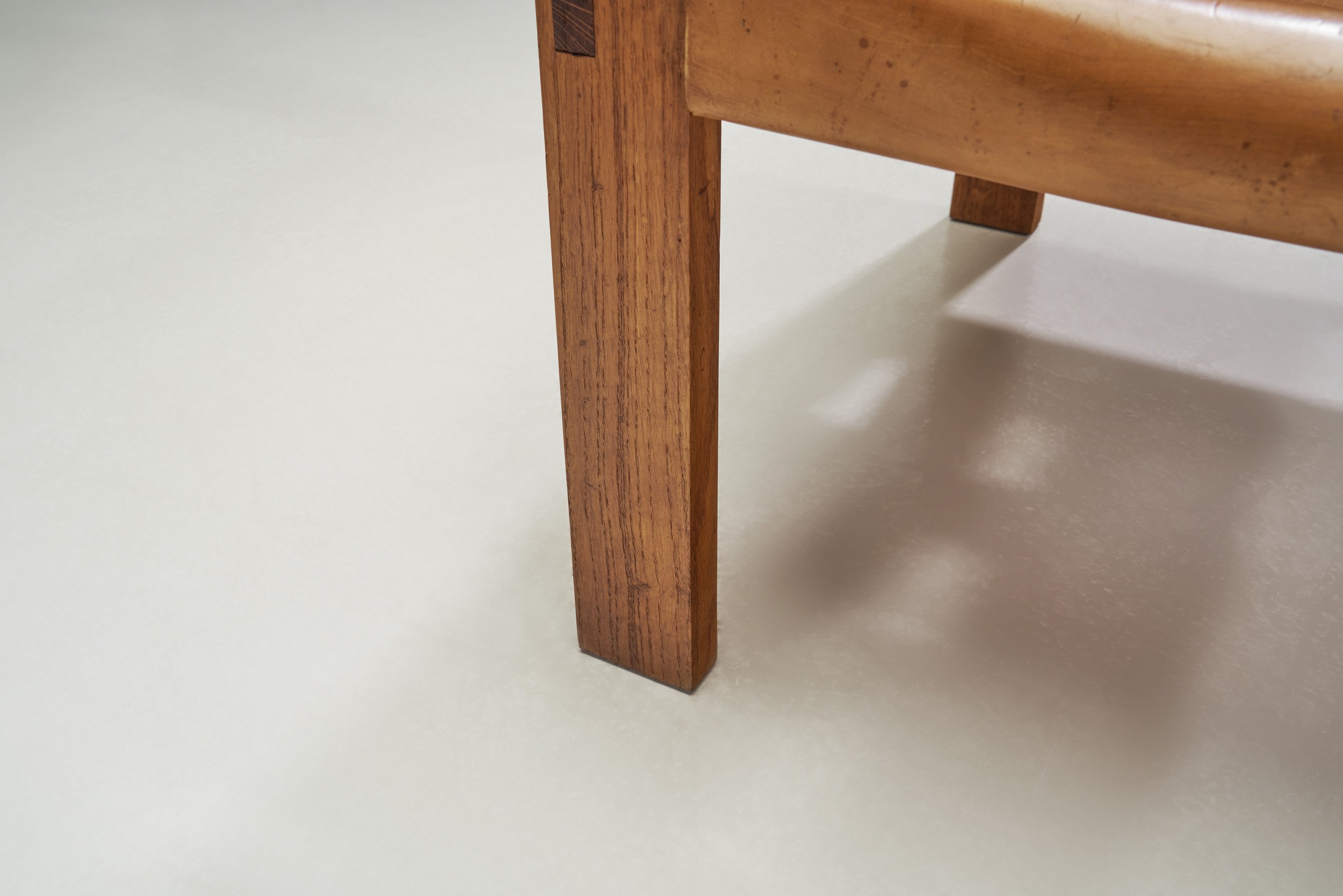 The design of this pair of remarkable chairs sits in a long tradition of safari chairs. From Eileen Gray to Kaare Klint and Elias Svedberg a lot of great designers have made versions of self-assembled furniture, which probably finds it origin in Indian Roorkhee Chairs used by the British military. The design recalls Pierre Chapo’s “S10” chair, with a similar frame that utilizes a simple, elegant construction with an impeccable joinery technique that also serves a decorative role. The mortise and tenon joinery is especially defining, joining the seats and the legs. The chairs have a confident outline with straight lines that allow the gorgeous patinated leather to stand out. Comprising the seats, arm- and backrests, the cognac leather is secured to the frames in various ways including belted straps on the seats, screws in the backs, and weaving on the backs. These differing methods add a lot to the chairs visually, and showcase the outstanding craftsmanship. Through a simple mechanism, the backs can be adjusted in their position for ultimate comfort.