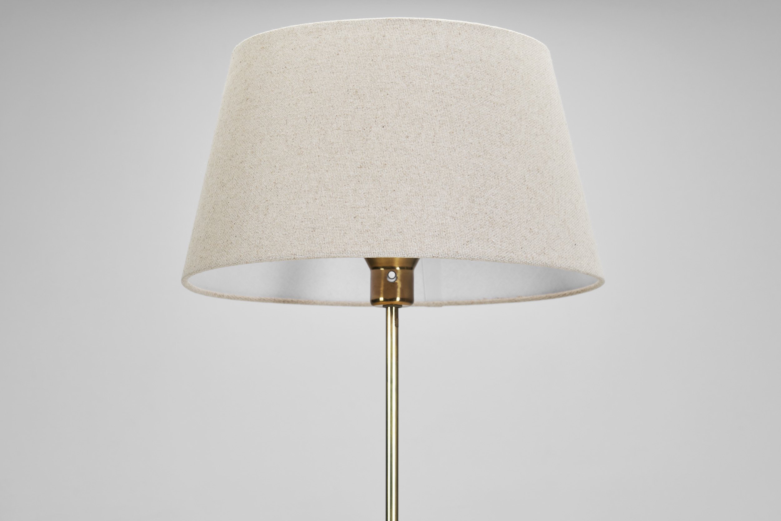 Swedish Modern, with its simplified lines and lack of excessive ornamentation, was a counter-reaction to the earlier, more decorative design movements, such as Art Deco. In comparison - as this floor lamp demonstrates - the mid-century era brought streamlined modernism to Sweden. This lamp has a classic, inherently elegant design that contemporary pieces still try to mimic. Like many of the decade’s designs, this lamp masterfully pairs materials and textures. As a result, the piece has an essentially Nordic modern look thanks to its understated and elegant design choices. The main material comprising the base and body is brass; the polished brass is the perfect material to showcase the curvature of the cone-shaped base, as well as the thin, sleek body of the stem. The texture of the lampshade’s fabric matches beautifully with the brass, and allows this ‘G-024’ model to complement any style of interior. In line with the Functionalist trend of the time, Alf Svensson & Yngvar Sandström abandoned ornamentation in favour of form for this piece. Nonetheless, the warmth and beauty inherent in Swedish design is maintained, as well as the high-quality craftsmanship expected of Swedish manufacturer Bergboms.