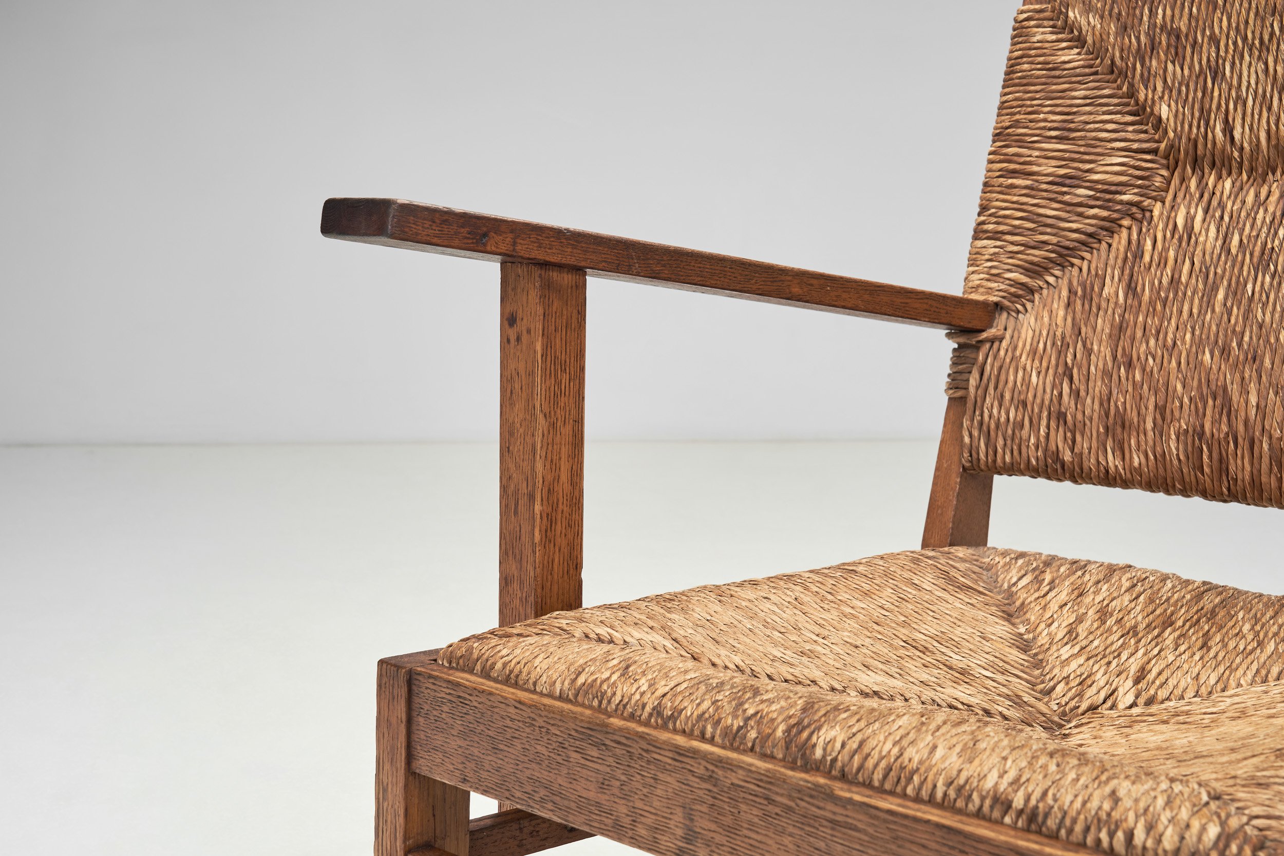 This pair of organic armchairs in solid oak and rush possess plenty of visual delights. The construction of this 1930s design is simple at its core, but thanks to its details, it is a playful representation of early Dutch modernism. This pair of armchairs stands as evidence why many European architects succeeded at the craft of furniture design; the precision of the structures and the rush weaving is evident at first glance, showing great geometric order. Driven by function, the designer’s focus was evidently on practicality, structural stability, and a design in favour of these principles. The straight lines and the absence of excess decoration are very typical of the era’s designers, who saw possibilities in the aesthetics of modernist design and materials. Next to the beautiful wood, the use of rush is the defining material of this pair. Noteworthy for its organic charm, the material is also beloved for its functional qualities. The seats and backs are made with a traditional hand weaving technique, where the twisted strands of fibre are wrapped around each corner of the frame in a continuous loop. The four parts comprising both the backrests and seats create a visually pleasing pattern that highlights the material and the weaver’s skill. These armchairs have equally arresting solid oak frames that show great craftsmanship as well. While made of solid oak, this pair of armchairs has an open feel to it thanks to the horizontal open spaces in the lower structures. The box structures are airy, balancing the solid wood’s heavy look. The sled legs ground the chairs, running parallel with the oak stretchers.