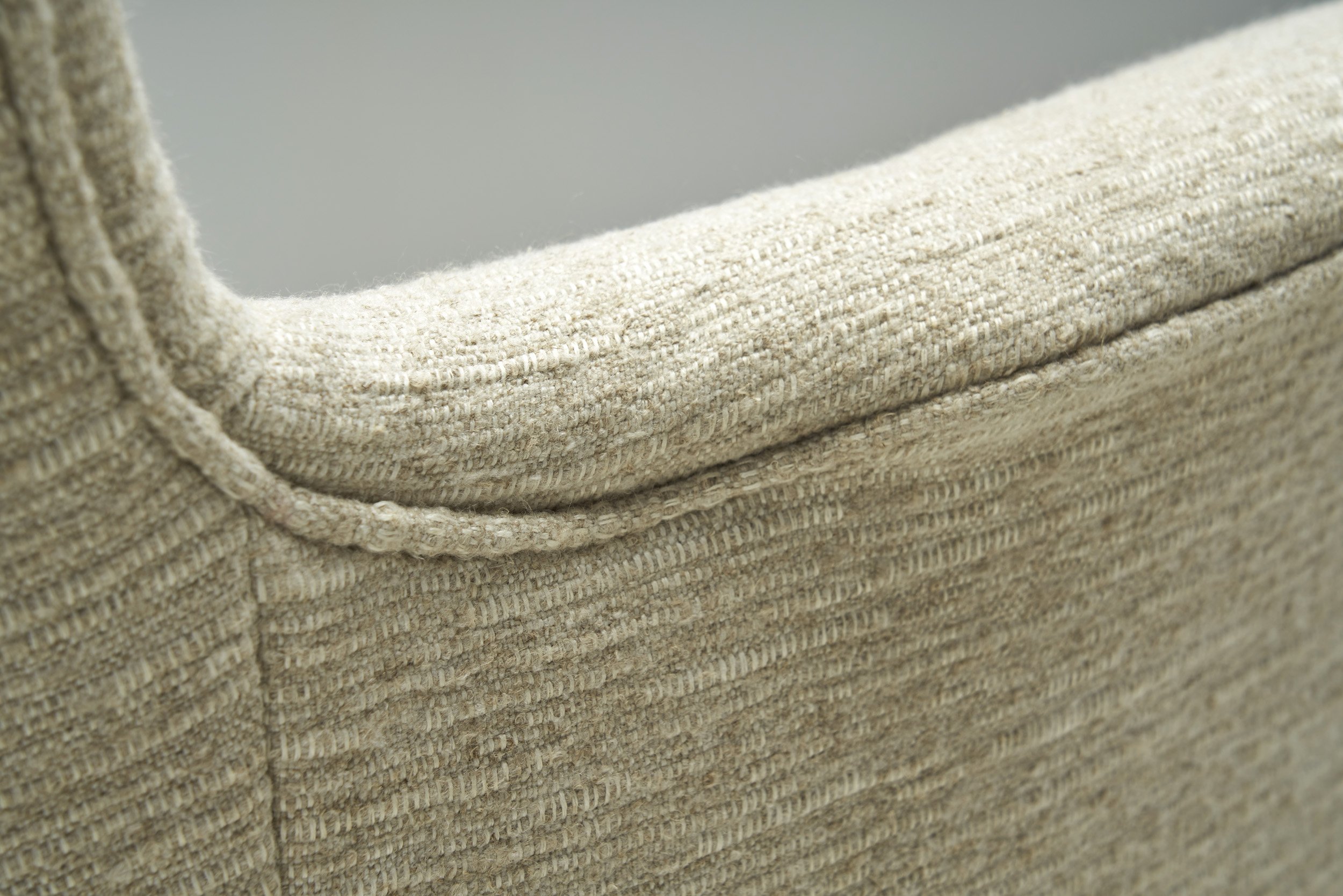 This Carl Malmsten chair model used to be owned by Carneruds (a furniture store on Götgatan, Stockholm) and therefore they had the exclusive rights to sell this model throughout Sweden. Carl Malmsten was known for his devotion to traditional Swedish craftsmanship (slöjd) and his opposition to functionalism. He "considered the rationalization of the home according to functionalist principles a debasement of its traditional role as an intimate place for gathering and repose". This pair of armchairs materialize this sentiment. The rounded edges and welcoming shape signifies the homely aesthetic Malmsten aimed for. Sharp corners are not to be found, as “neither light, nor eyes or people like bumping into sharp corners”, as the designer once explained. The tufted buttons on the back further add to the cosy look, and the outward curving arms and back assure comfort. The solid wood legs add am organic touch, and used to come in custom lengths, manufactured based on the client’s needs.