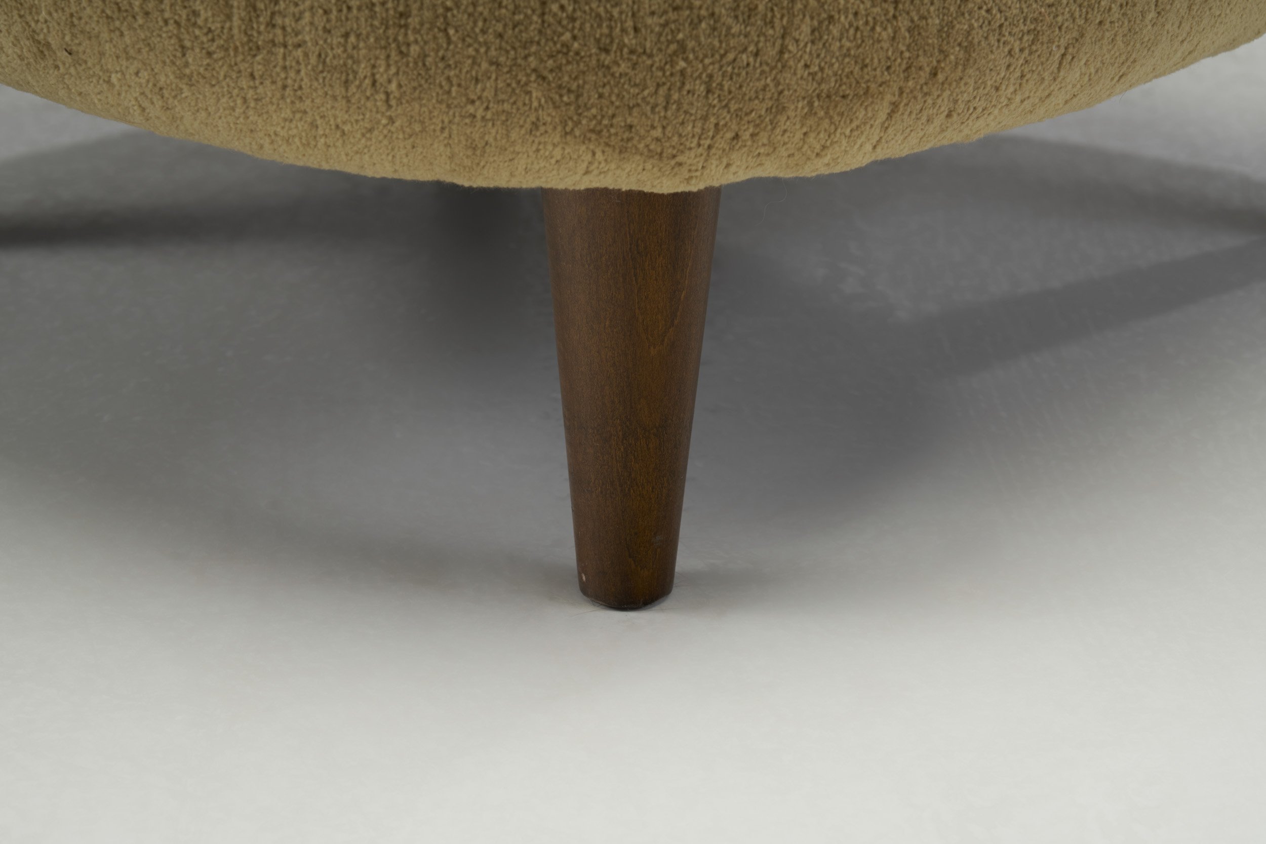 Through decades of changes in styles and preferences, the various iterations of what has come to be called Scandinavian Modern have managed to go on “speaking” to users, collectors, and design aficionados in rapidly changing cultures. Designed in the golden age of what we know today as mid-century modern, these lounge chairs are delicacies with a unique look. With a classic shape paired with modern design elements, the design combines the best aesthetic characteristics of the 1950s. The large, enveloping backrests dictate the shape of the chairs, as they visually form most of the structure. The edges curve outwards and the backs have a unique shape that resembles a fan. These curves create an inviting and open look, enhanced by the soft upholstery and the decorative button tufting. The large seats add a lot of volume to the design, keeping it grounded, therefore cosy. The sculpted conical legs are a pleasant touch, adding straight lines to the otherwise round edges. The warm brown colour of the wood nicely contrasts to the soft, light colour of the body, not to mention that wooden feet make a long-lasting, rock solid foundation for any chair. Master cabinetmakers were highly aware of body proportions, prioritizing comfort just as much as the visual qualities, therefore these lounge chairs provide ample support for the back and great sitting comfort.
