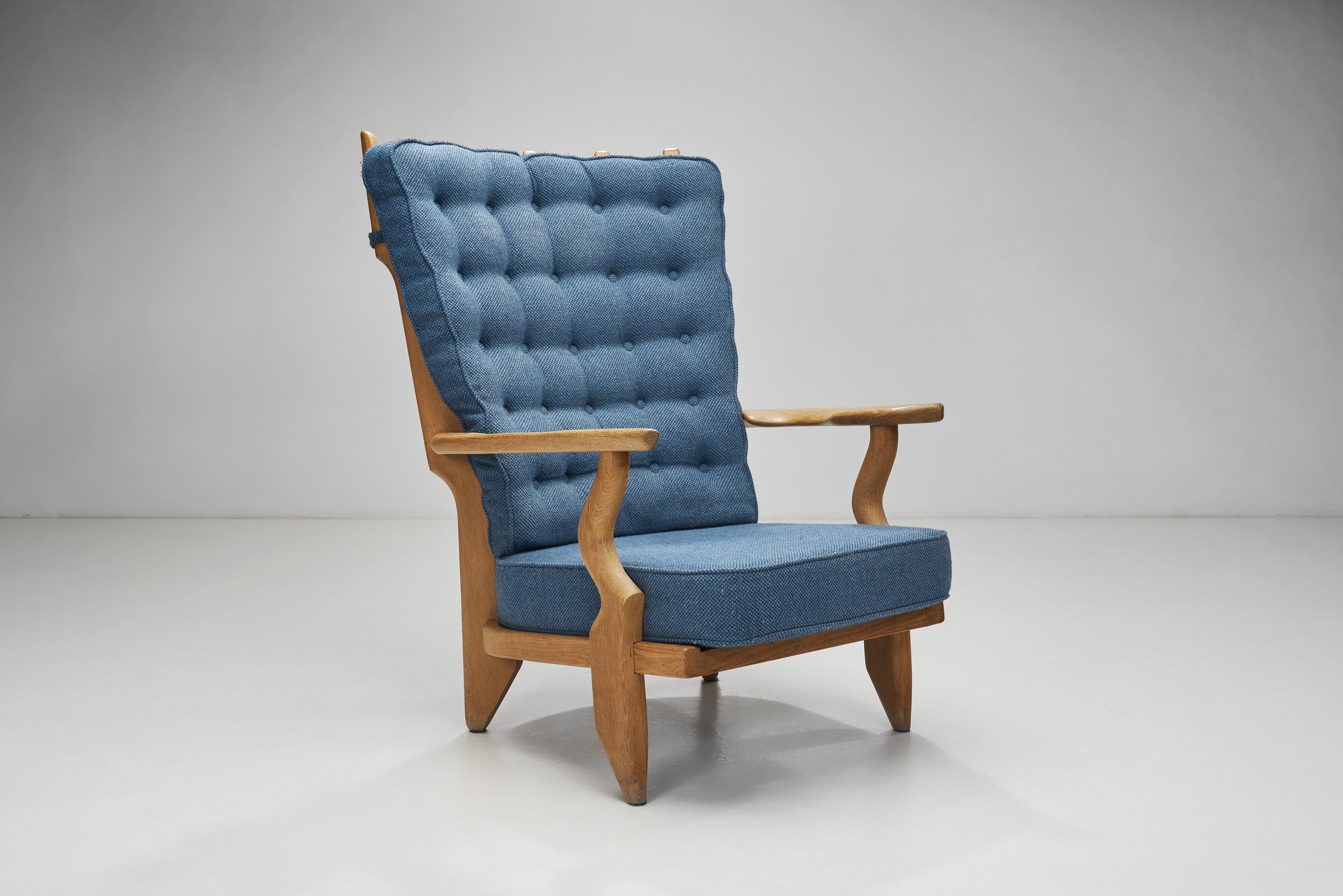 These Guillerme et Chambron ‘Grand Repos’ Lounge Chairs display a beautiful contrast between the light wooden oak frame and the elegant blue fabric of the cushions. With a solid wooden frame, the support for the back is made with six wooden spindles extending upwards yet slightly curved, resulting in a rounded backrest.