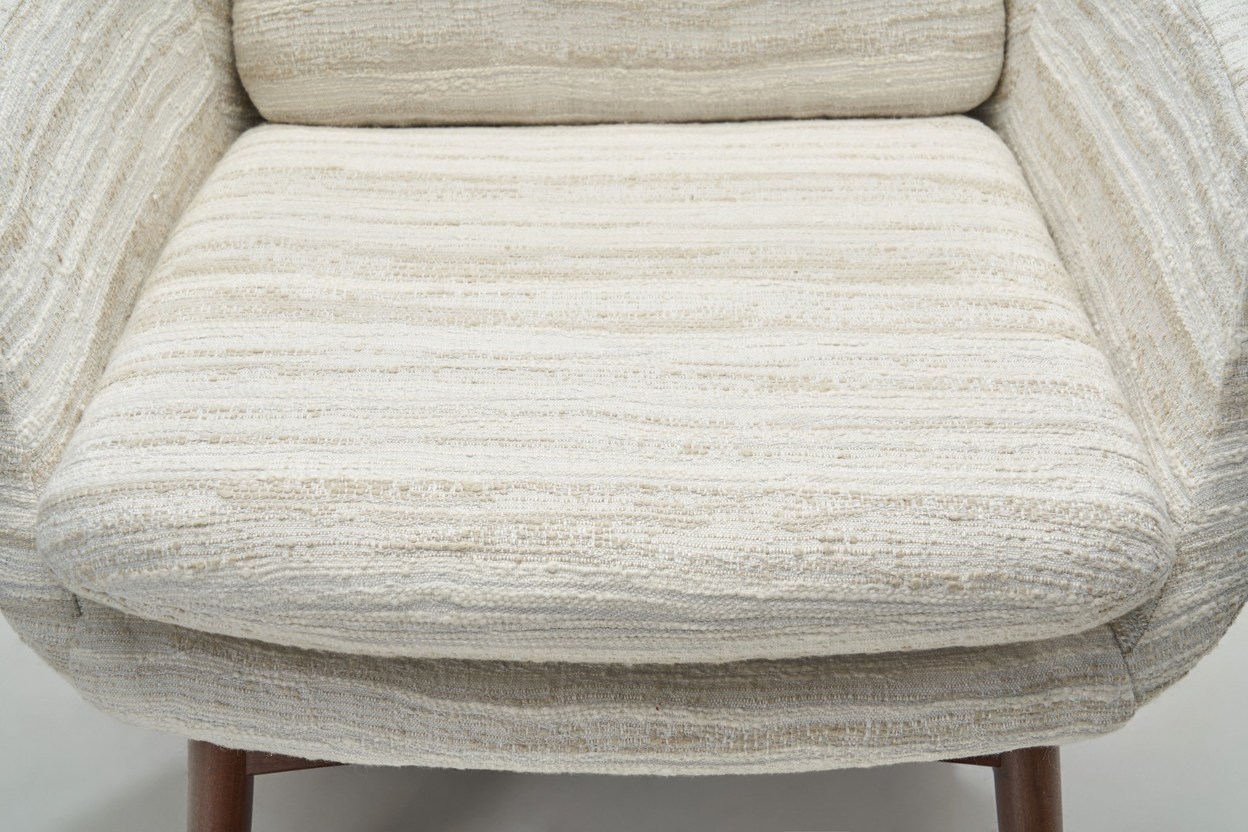 In good vintage condition. Wear consistent with age and use. The armchairs have been reupholstered recently in premium fabric. Each of our items can be re-upholstered by our in-house atelier in a fabric of choice. Please reach out for more information.