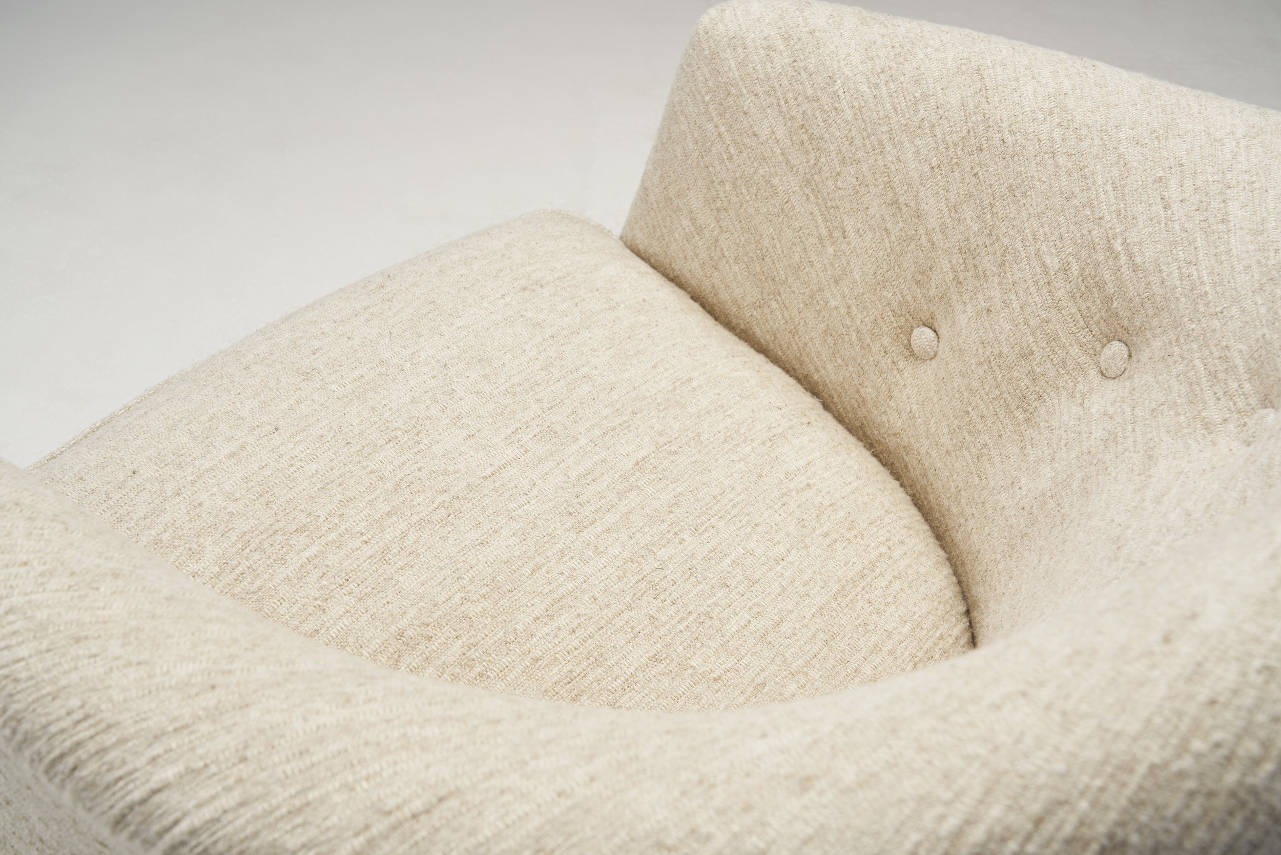 This armchair holds a soft simplicity and a uniqueness in its appearance - light, clean lines with an air of romance. Without worrying about short-lived trends and what other people thought, Kerstin Hörlin-Holmquist created the gentle, peculiar shape of this armchair that is only increasing in popularity even today. Thanks to her unique vision, this “Little Adam” has an unmistakeable backrest that flows down to form the armrests. While the armrests sit low, therefore opening the seat, the chair still has the impression of hugging the sitter. The fully upholstered body elevates the visual comfort, with a stitch tufted backrest that is festooned with buttons arranged in a hill shape. This subtle form of decoration highlights the shape of the back by mirroring it, while also accentuating the light fabric by giving it extra depth. The stained and tapered wood legs pair perfectly with the organic form of the body. Contrasting the front legs, the back ones are lightly splayed to provide great structural stability.