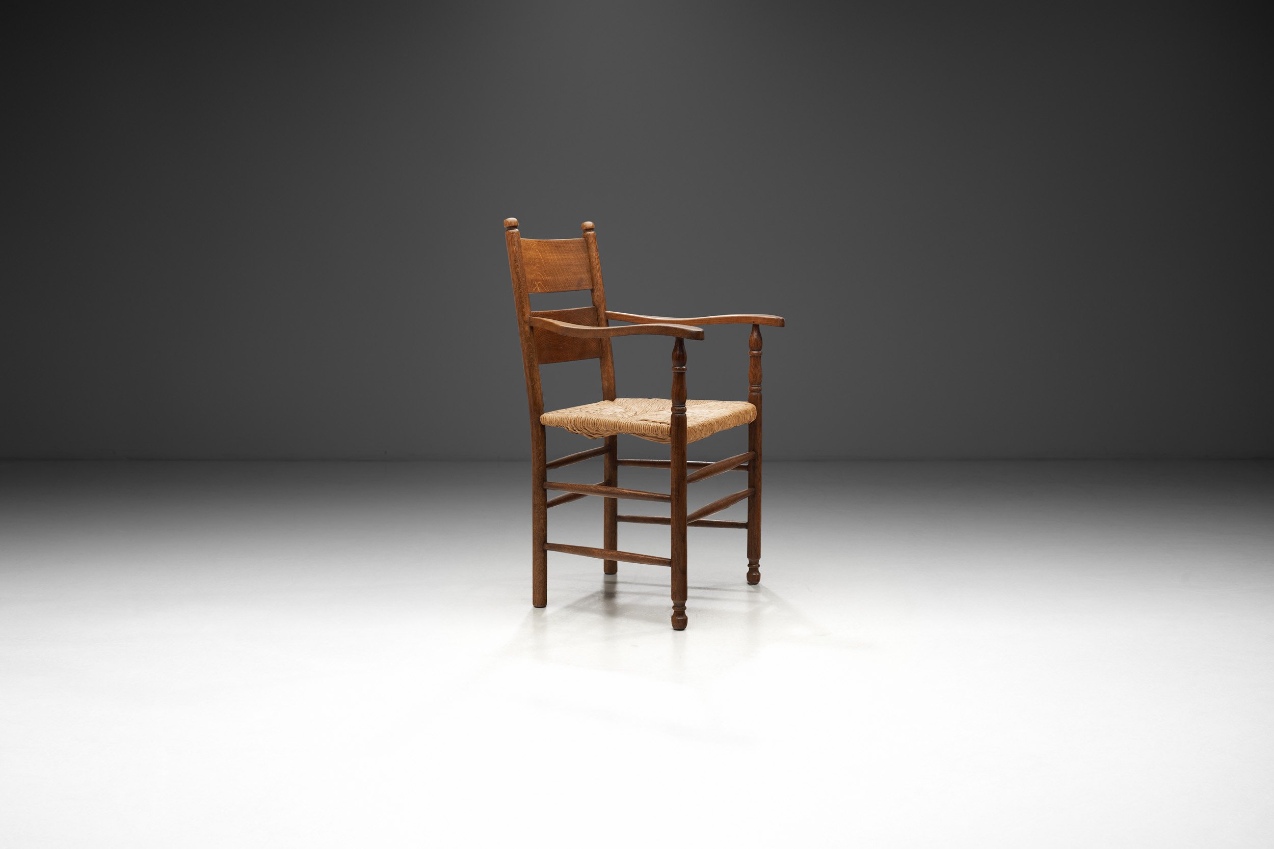 This armchair showcases a timeless blend of simplicity and craftsmanship. Constructed from solid oak, the chair features a sturdy frame with a warm, natural finish that highlights the wood's grain and durability. Oak was the favoured material in this period for its resilience and beautiful grain pattern, thus increasing the visual depth of the chair. The seat is made of tightly woven rush, which adds beautiful texture and a traditional look, while still maintaining comfort through its natural flexibility. By being entirely constructed from natural materials, this piece maintains its classic charm typical of early 20th century furniture, while adding versatility through its unpretentious, organic character. The armrests feature a subtle curve, providing ergonomic support, highlighting the chair's understated elegance. Two wooden stretchers are positioned between each pair of legs, creating symmetry within the design. These additions go beyond their aesthetic purpose - not only do they complete the design but they also reinforce the structure, lending it additional stability.